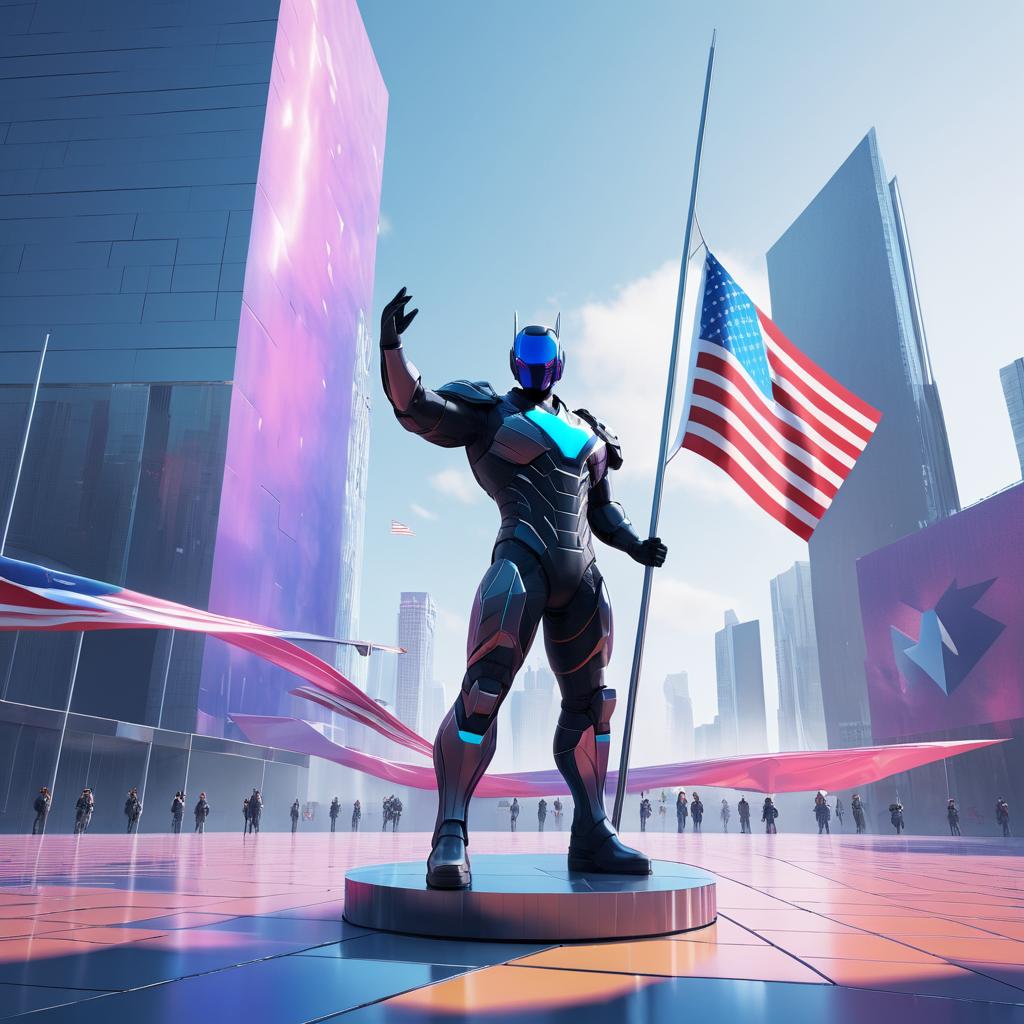 A transforming superhero in a futuristic urban environment, waving a flag in a high-tech plaza. Created by Beeple, Banksy, high-quality 3D render with psychological themes.