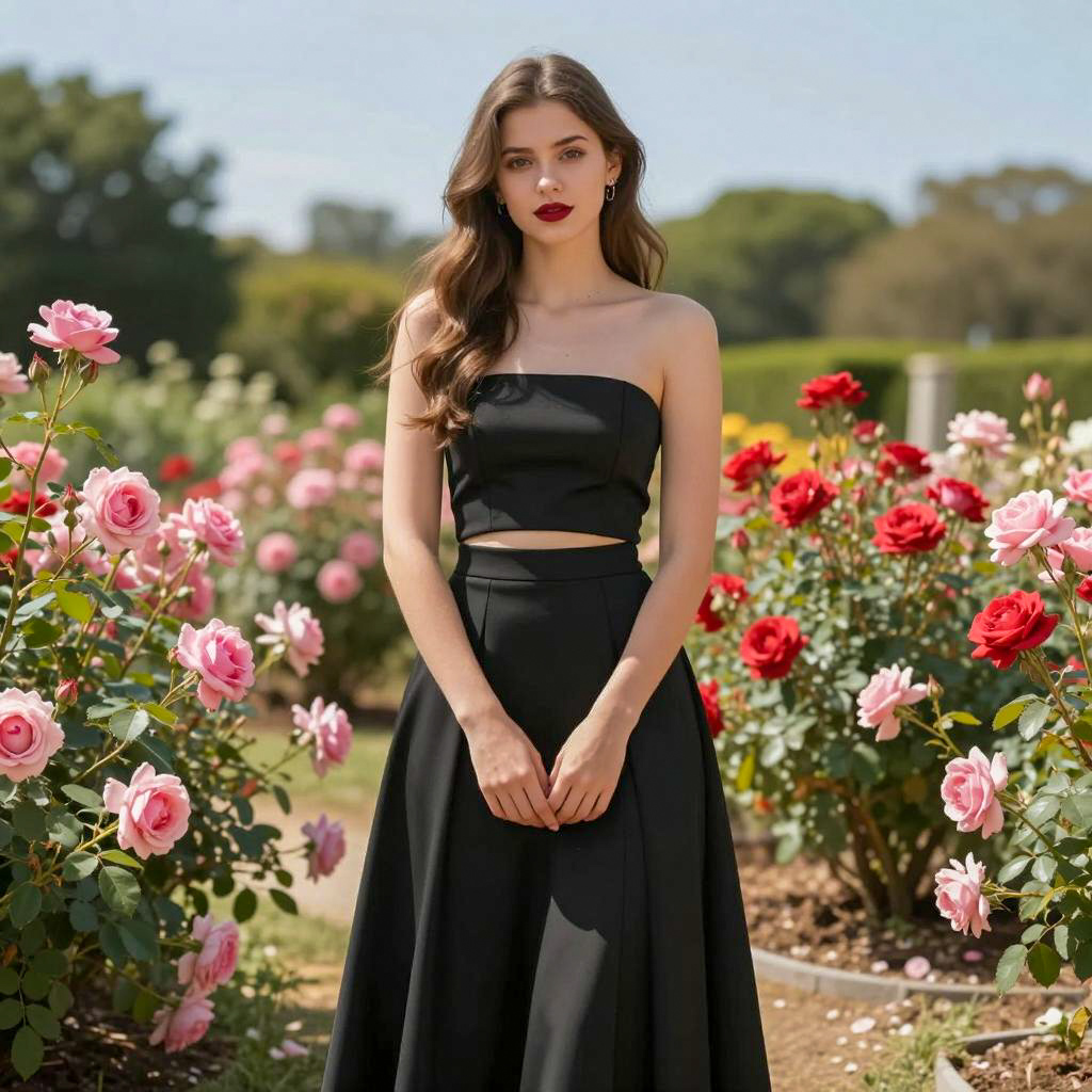 Elegant Woman in Strapless Black Dress in Garden