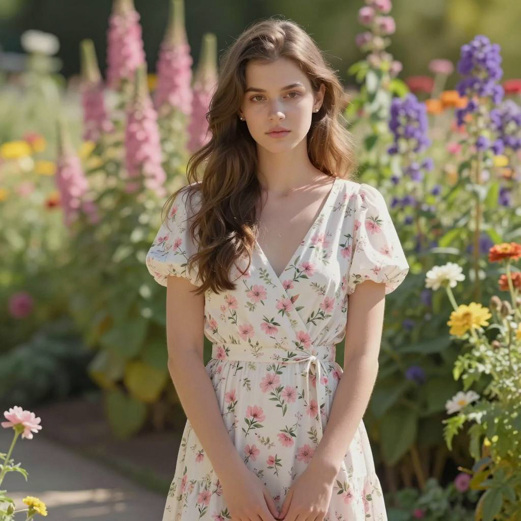 Portrait of a beautiful woman with long brown hair wearing a strapless black dress standing on a garden path. The setting features colorful flowers and green foliage with bright natural sunlight creating a soft focus background. The woman has red lipstick and a serious expression, captured in a serene summer atmosphere.