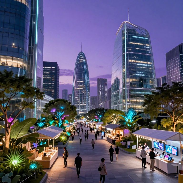 Pavaga in a futuristic cityscape, featuring sleek transparent buildings intertwined with nature, bioluminescent plants lining the streets, and diverse people exploring advanced technology markets under a deep purple twilight.
