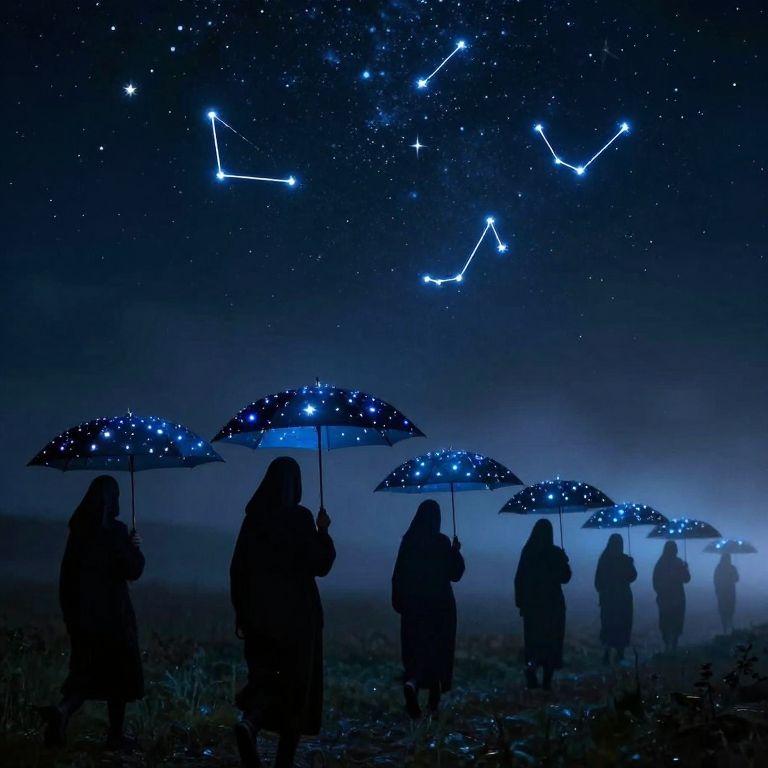 A procession of figures cloaked in shadow holds umbrellas that emit luminous constellations, transforming the night sky into a portable tapestry of stars as they traverse a misty, otherworldly plain.