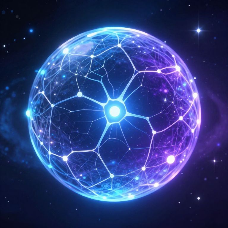 Digital artwork of a glowing, translucent blue and purple sphere set against a dark, star-filled space background. The sphere is intricately connected by white, glowing lines forming a network of nodes, reminiscent of a molecular or neural structure. Bright white and blue light emanates from the center, creating a luminous halo effect. Small white stars are scattered around the sphere, enhancing the cosmic theme. The overall texture is smooth and ethereal, with a futuristic, sci-fi aesthetic.