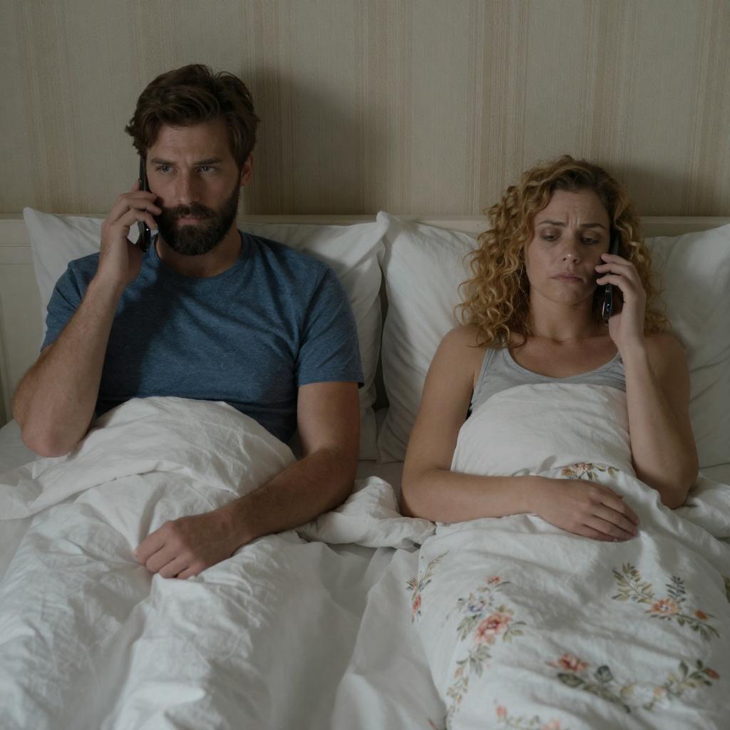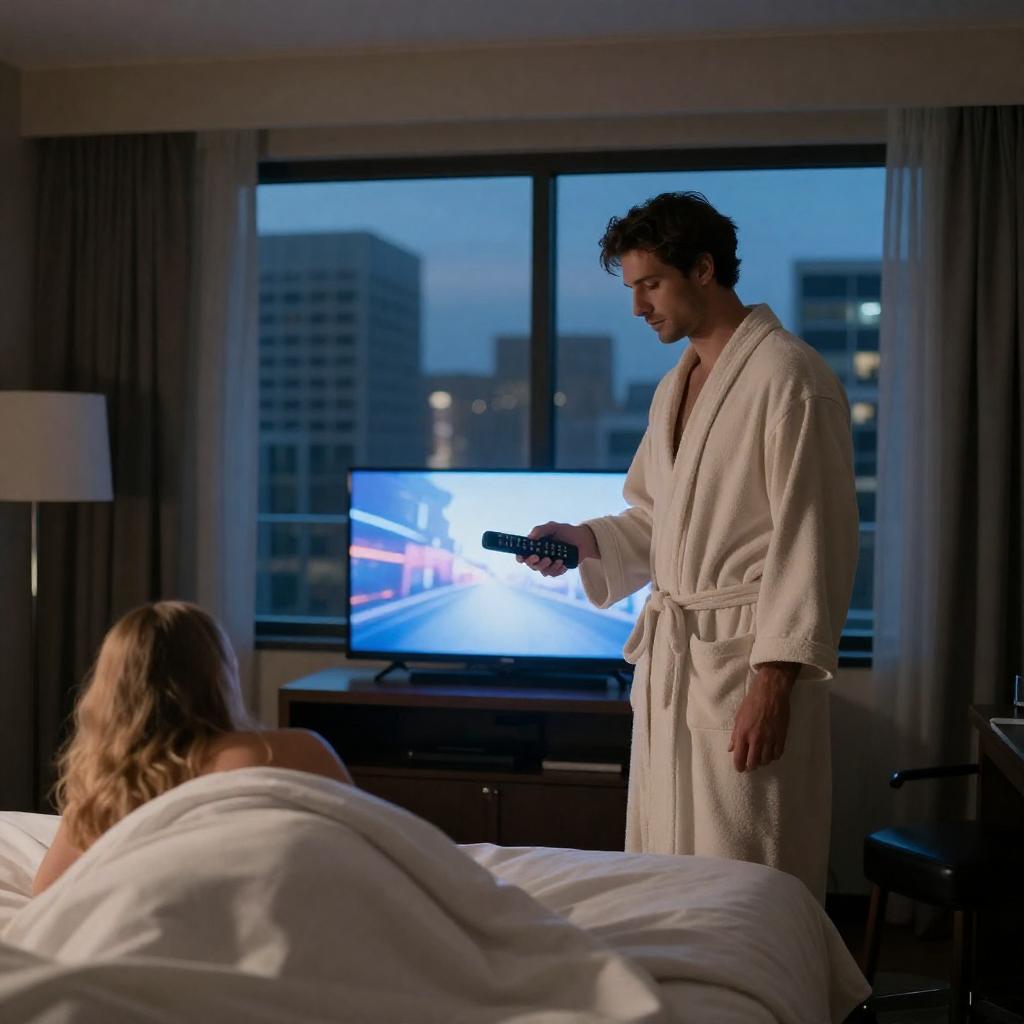 Photograph of a dimly lit hotel room at night. A man with dark hair in a beige robe stands near a bed, holding a remote control. A woman with blonde hair, partially covered, lies on the bed. Large window behind them shows a cityscape with tall buildings and a blue sky. TV on a table displays a colorful image. Lamp on the left, curtains on the sides. Man looking down at remote, woman facing away.