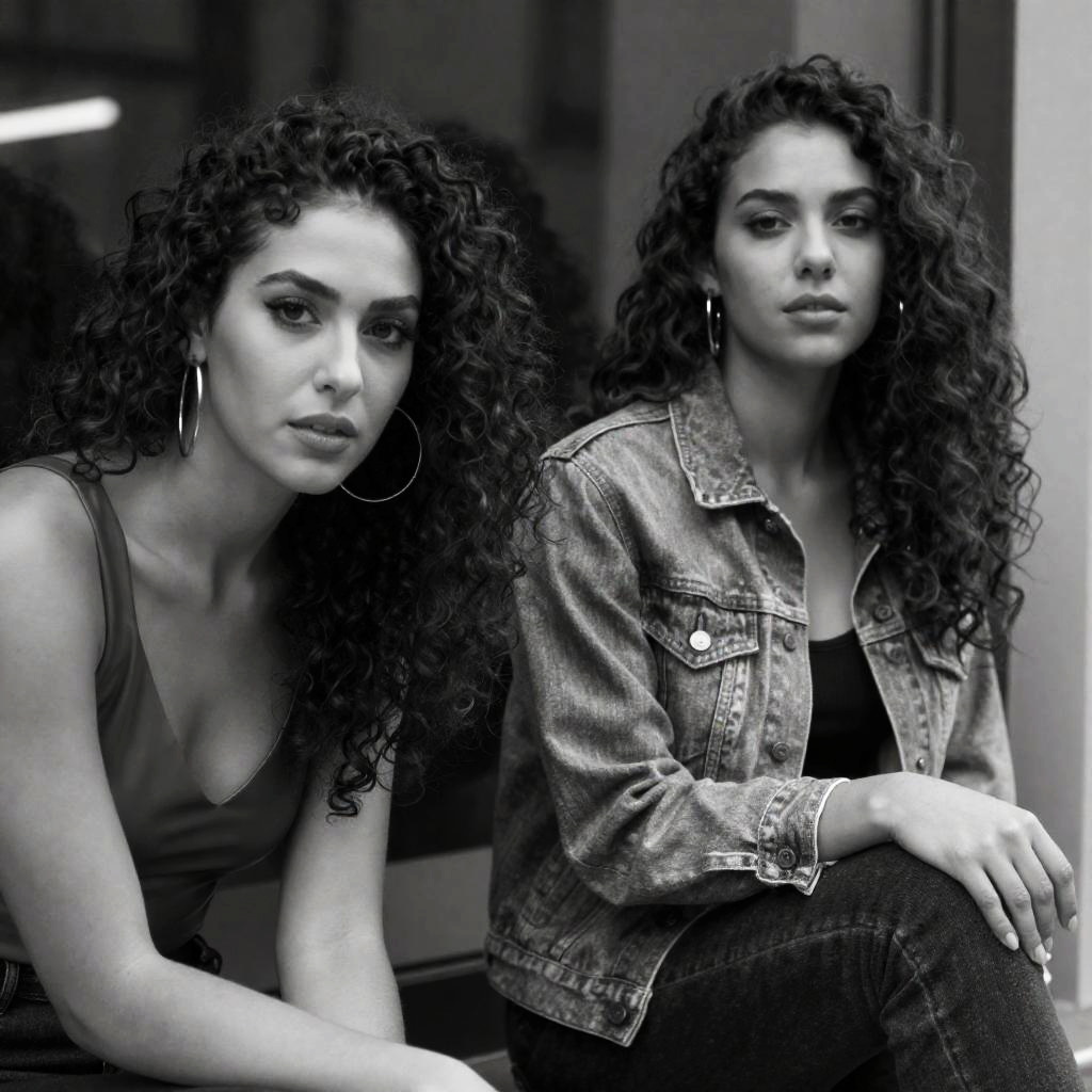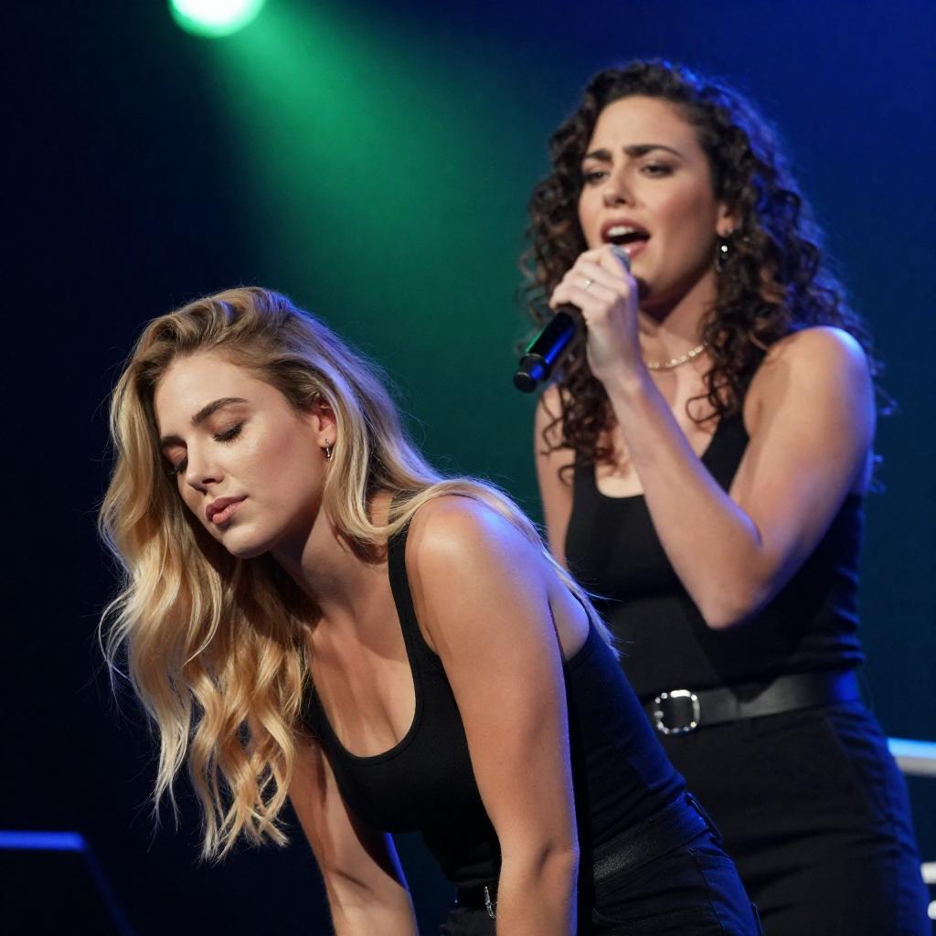 Photograph of two women on stage. Blonde woman in black tank top leans forward, eyes closed. Brunette woman with curly hair, black top, and microphone stands behind, singing passionately. Bright green and blue stage lights in background.
