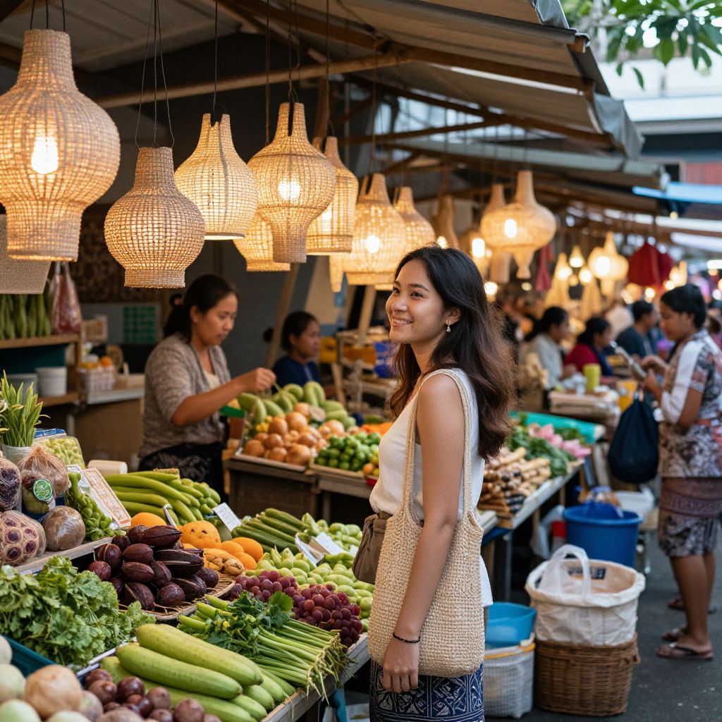 Smiling woman exploring the vibrant Ubud Market in Bali, surrounded by hanging woven lanterns, fresh produce displays, and bustling vendors.