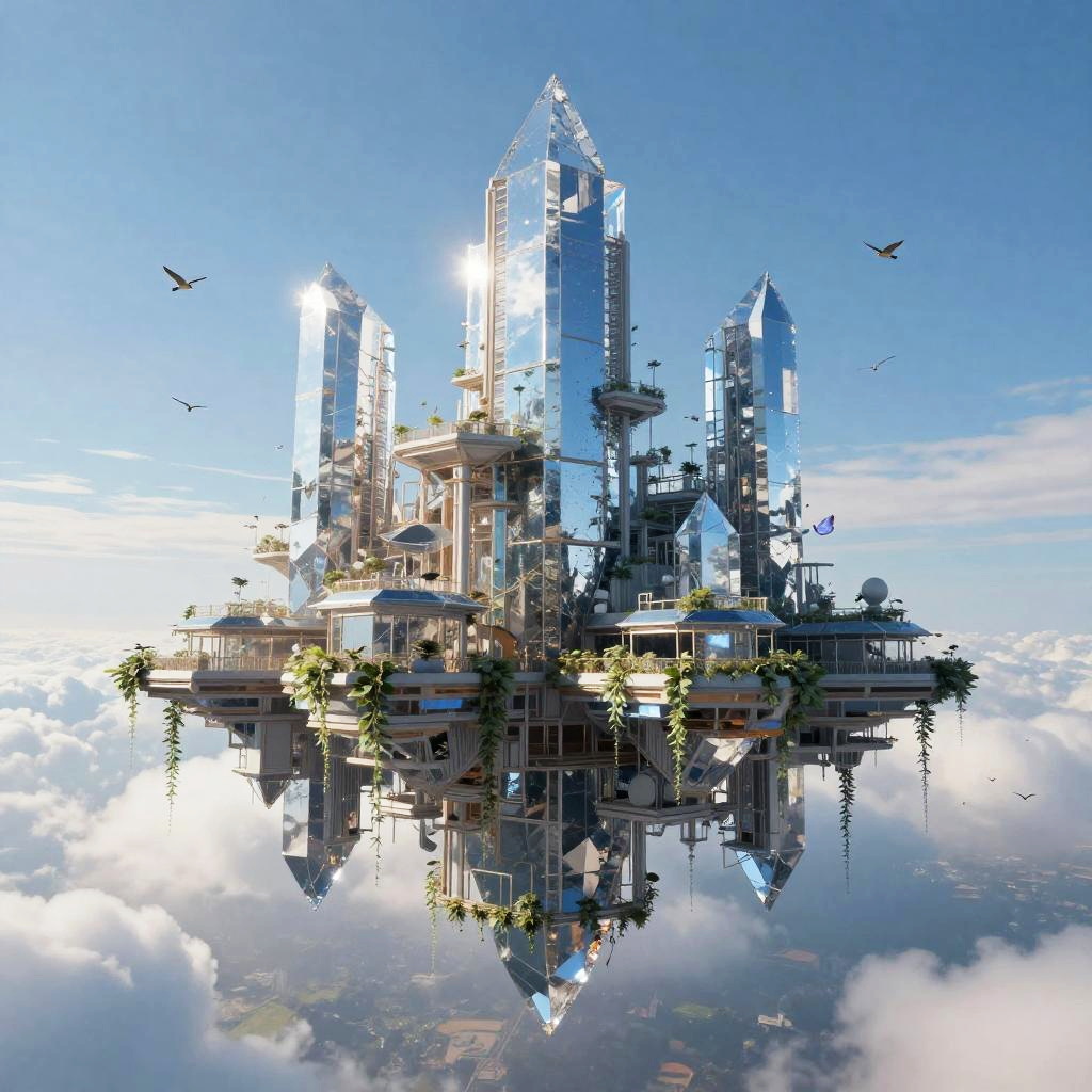 Floating city in the sky depicted as a massive crystal metropolis, reflective surfaces capturing the cloudscape, surrounded by birds and delicate vines hanging from platforms under a clear blue sky.