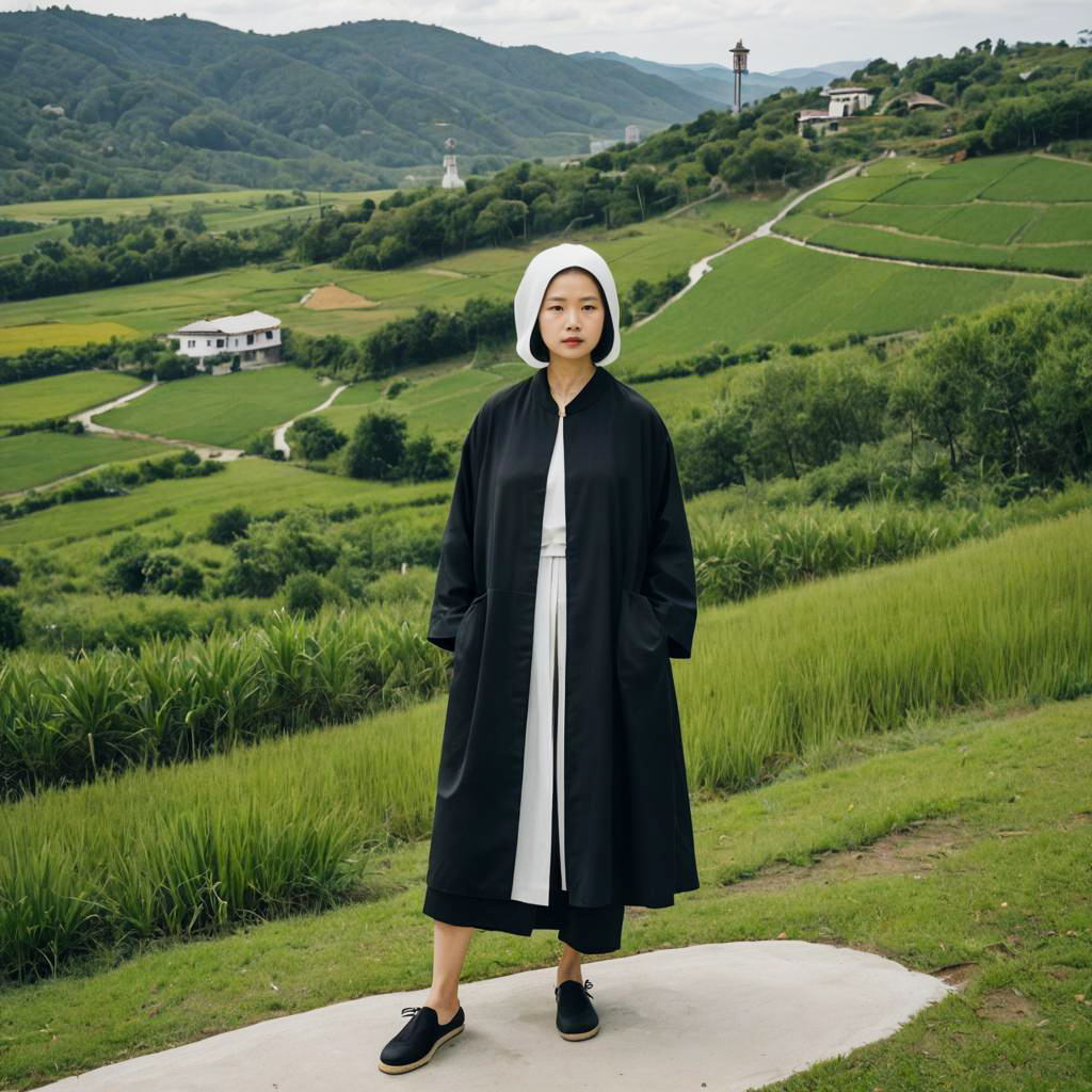 Photo of an Asian woman dressed in a surreal nun-inspired outfit, featuring a black bamboo habit, a white rayon coif, a long olive green robe, and black espadrilles. She is standing on a path overlooking lush green rolling hills and scattered white houses under a clear sky.
