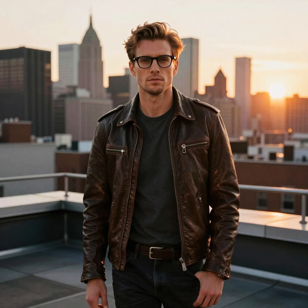 White dude with glasses, standing confidently on a city rooftop at sunset, wearing a leather jacket, urban skyline in background, cinematic lighting, detailed portrait