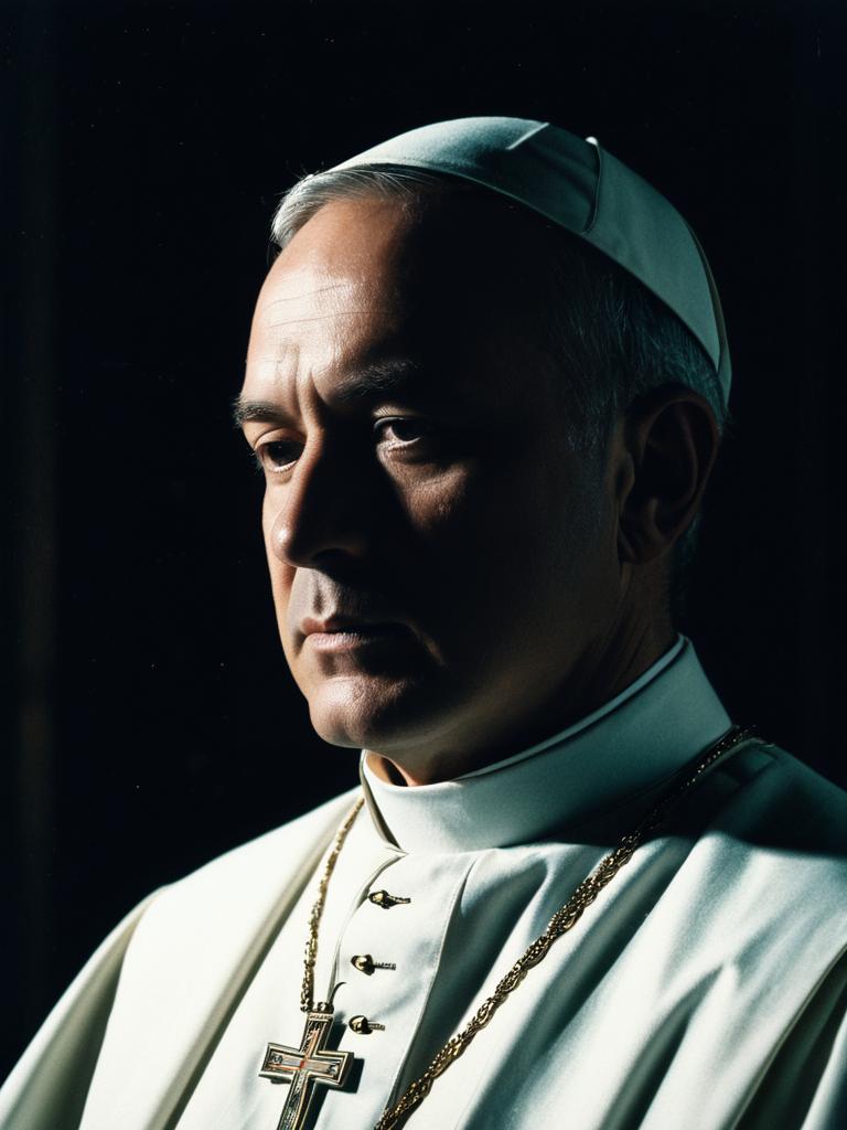 Dramatic cinematic portrait of a middle-aged man dressed in traditional Catholic priest attire, including a black cassock and a large ornate gold cross necklace. The lighting is soft and focused, highlighting his solemn expression and creating a reverent atmosphere, suggesting an indoor church or chapel setting.