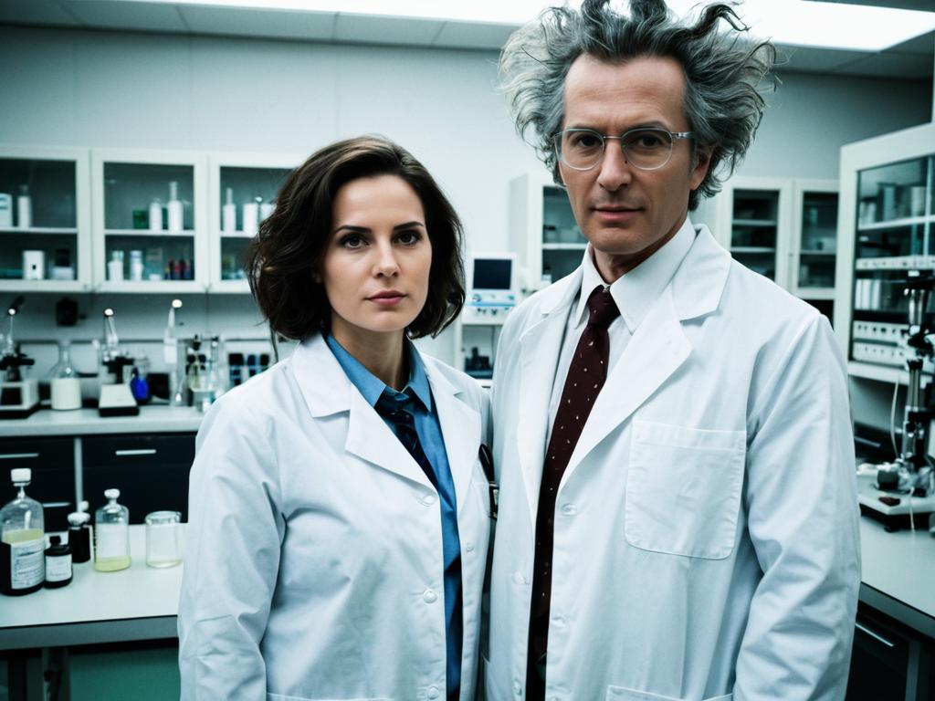 Mad Scientist Costume Adults face swap, woman in lab coat and tie standing in a laboratory