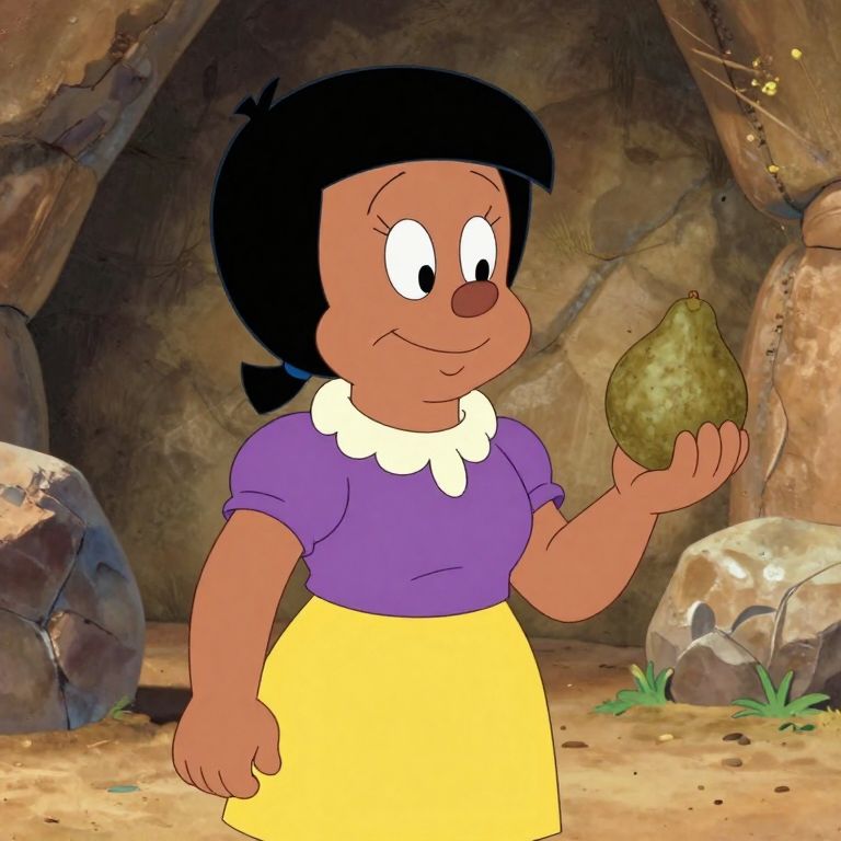 Digital cartoon image of a brown-skinned woman with black hair in a ponytail, wearing a purple short-sleeved top with a white collar and a yellow skirt. She holds a green, textured pear in her right hand, smiling. The background features a rocky cave with large boulders, small yellow flowers, and patches of grass on the ground. The style is reminiscent of classic 2D animation, with bold colors and simple, clean lines. The woman has large, expressive eyes and a small, round nose.