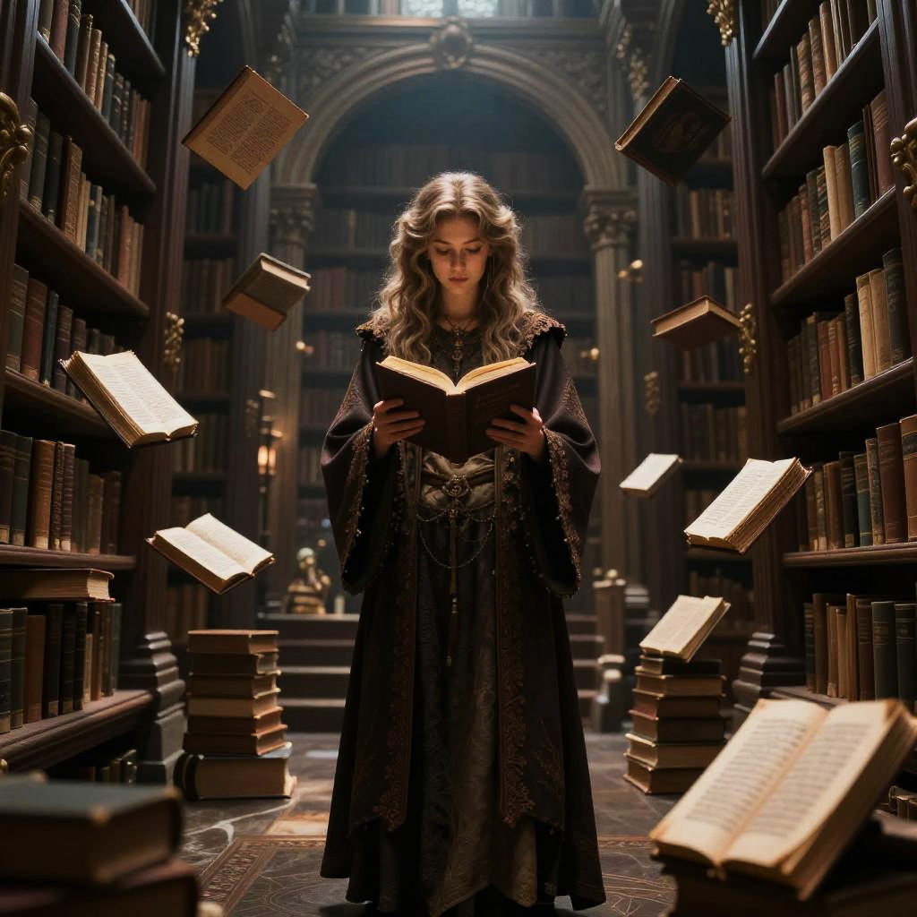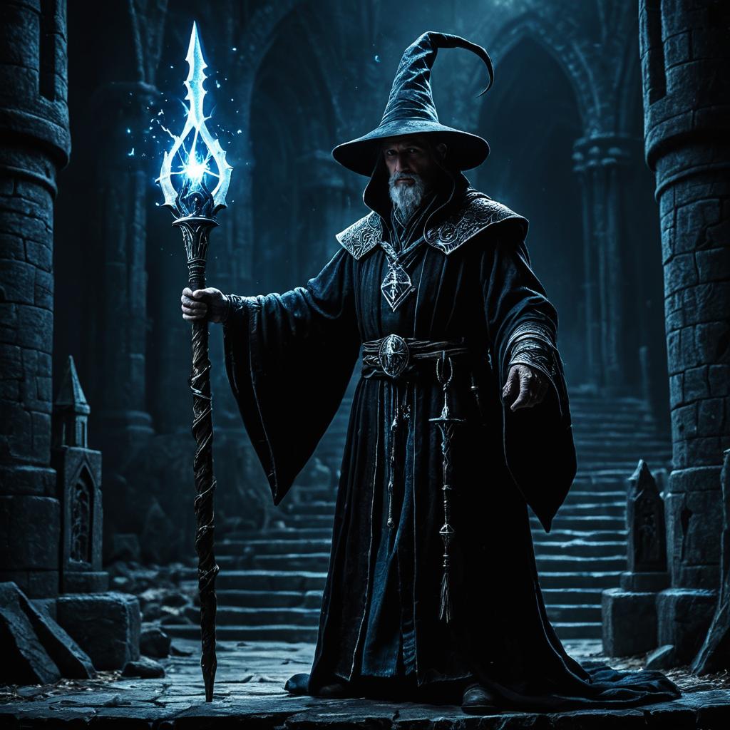 Evil Sorcerer with Glowing Staff in Arcane Tower