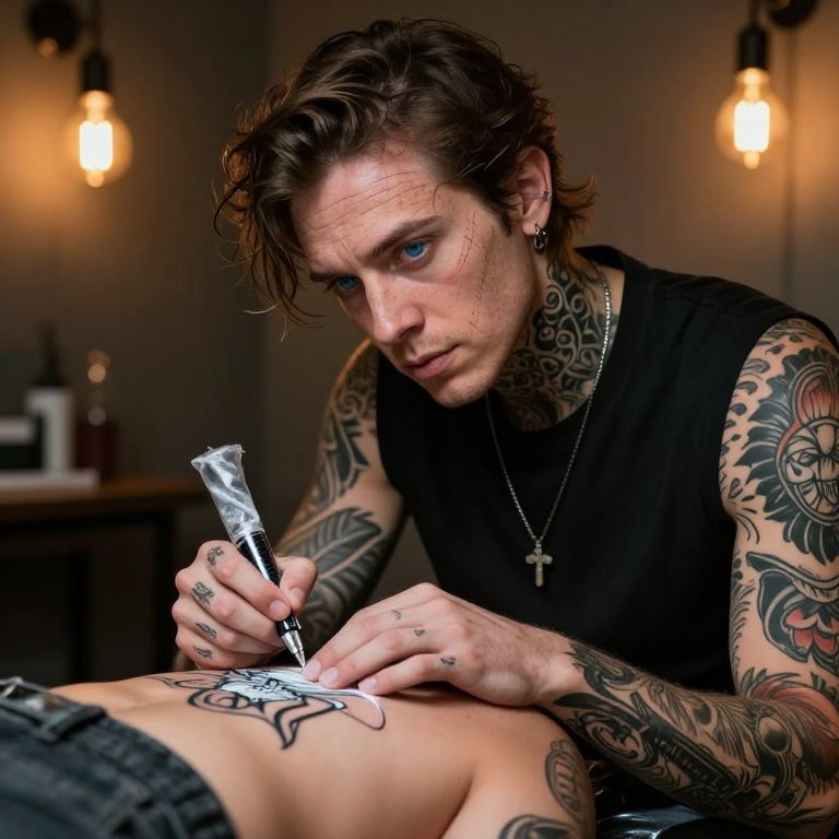 Create a captivating portrait of an enigmatic tattoo artist with serene blue eyes and intricate sleeve tattoos. Capture them as they meticulously trace a design onto a client's skin using chalk under soft studio lighting, embodying a fusion of focus and artistic flair. The scene unfolds in a dimly lit room bathed in the warm glow of incandescent bulbs, casting subtle shadows on their retro face, revealing lines that speak to life experience etched into their expression. As they remain deeply engrossed in their work, an emotional spectrum spans from quiet confidence to creative passion, showcasing both expertise and dedication inherent in their craft.