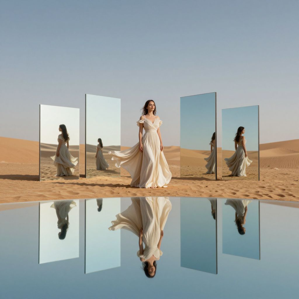 Woman in flowing gown stands amidst a surreal desert landscape, surrounded by five reflective mirrors of varying sizes that distort her image, casting intricate reflections in a tranquil pool of water below.