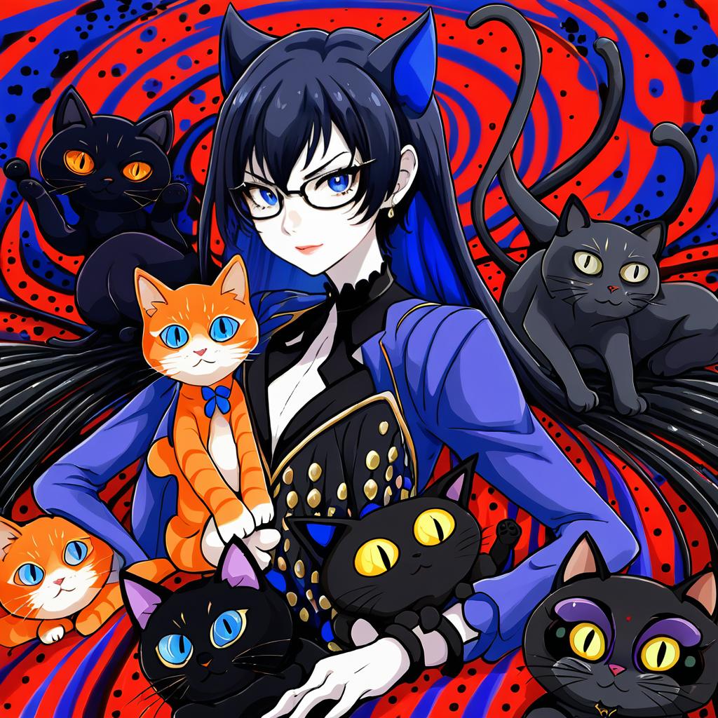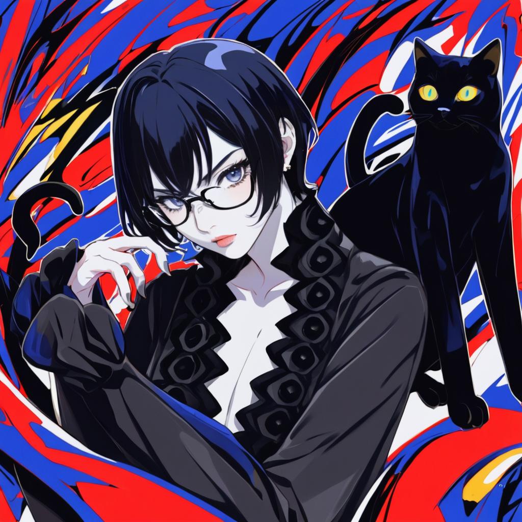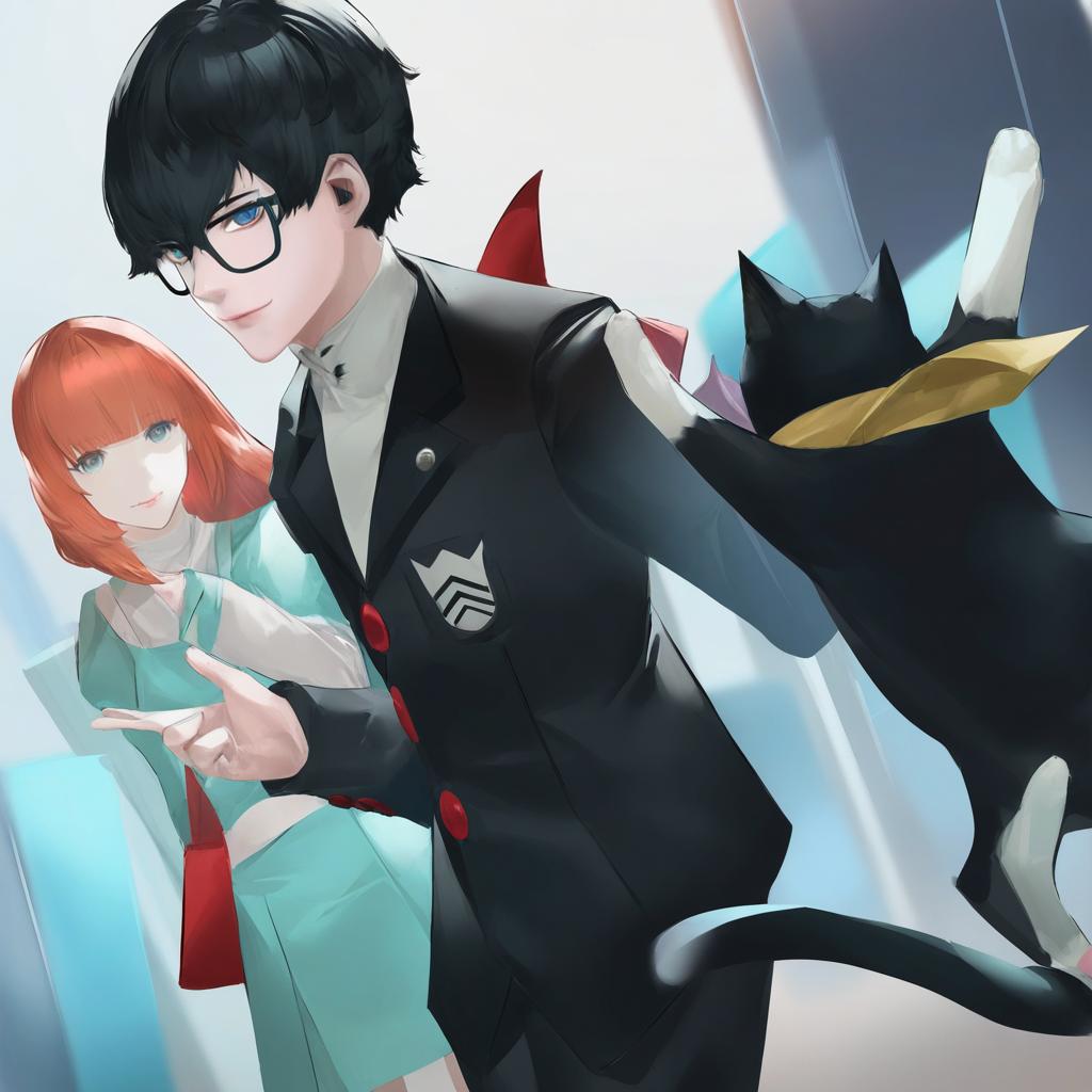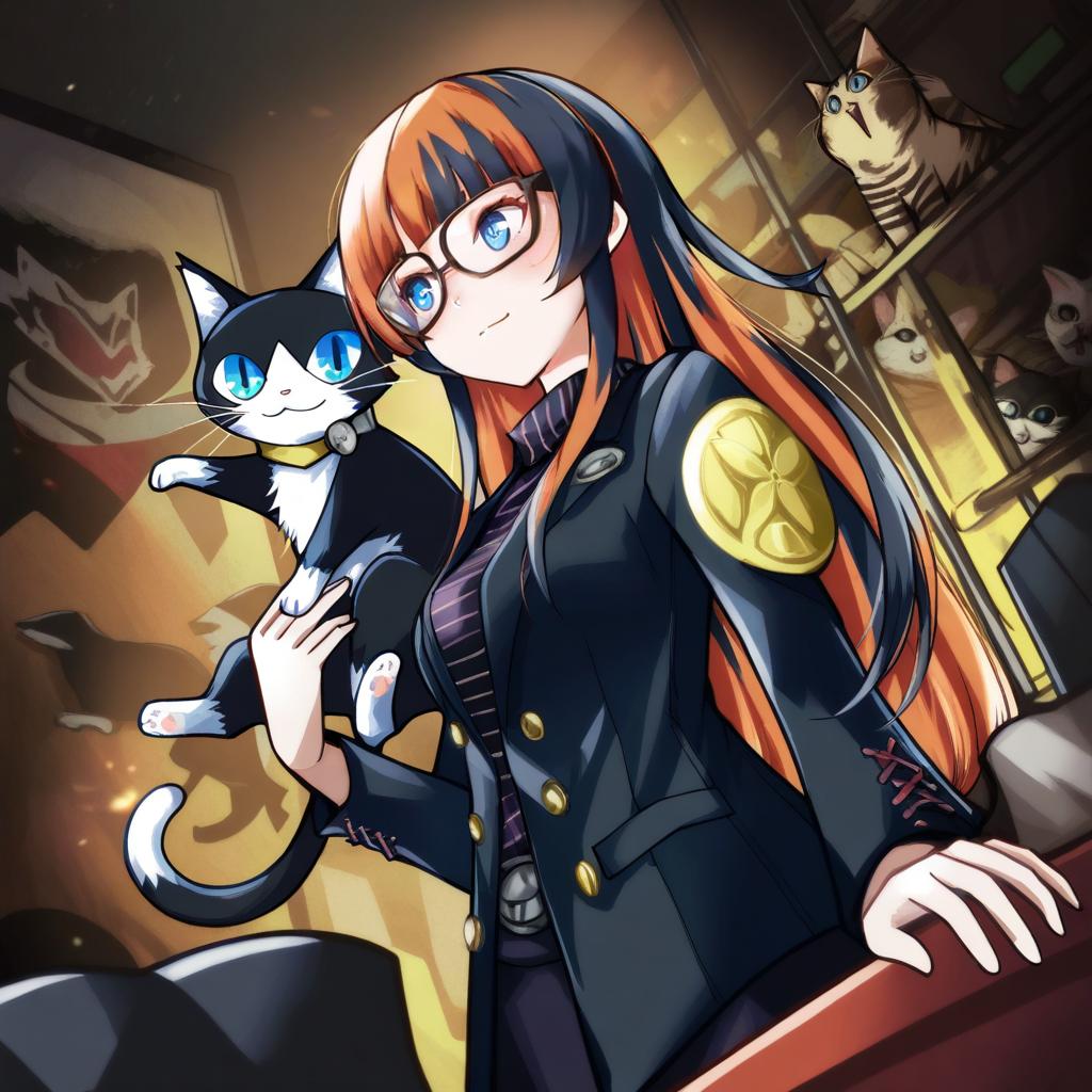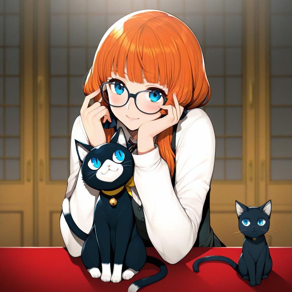 Morgana (persona 5), persona, blue eyes, glasses, long hair, short hair, black hair, orange hair, long sleeves, cat, black cat, animal, by artist boa (brianoa), animagine