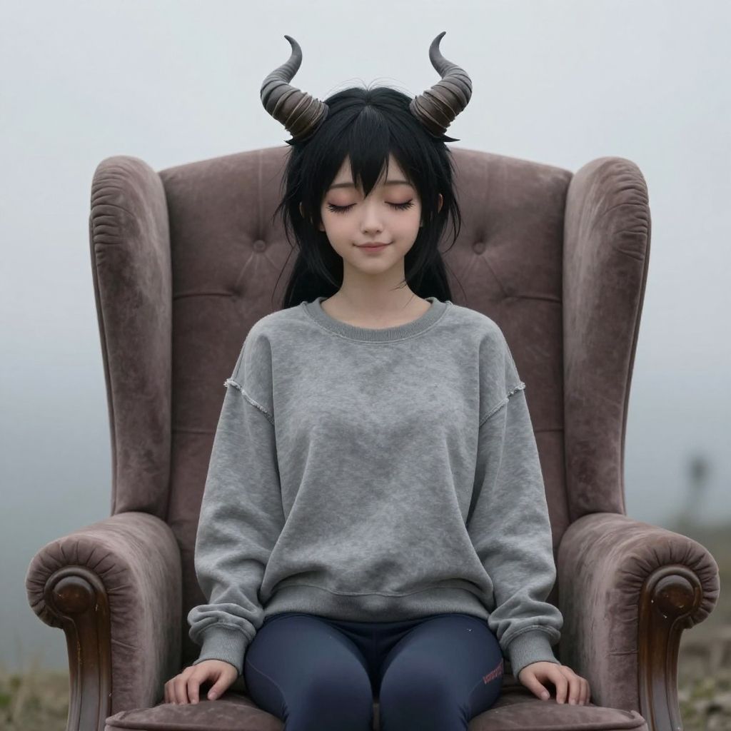 Photograph of a young Asian girl with black hair and small, curved black horns, sitting on a large, plush, purple armchair. She wears a gray, slightly oversized sweatshirt with small tears on the sleeves and dark blue jeans. Her eyes are closed, and she has a calm expression. The background is a blurred, overcast sky, with no distinct objects visible. The armchair has high, tufted arms and a soft texture. The overall mood is serene and fantastical, with the horns adding a mythical element.