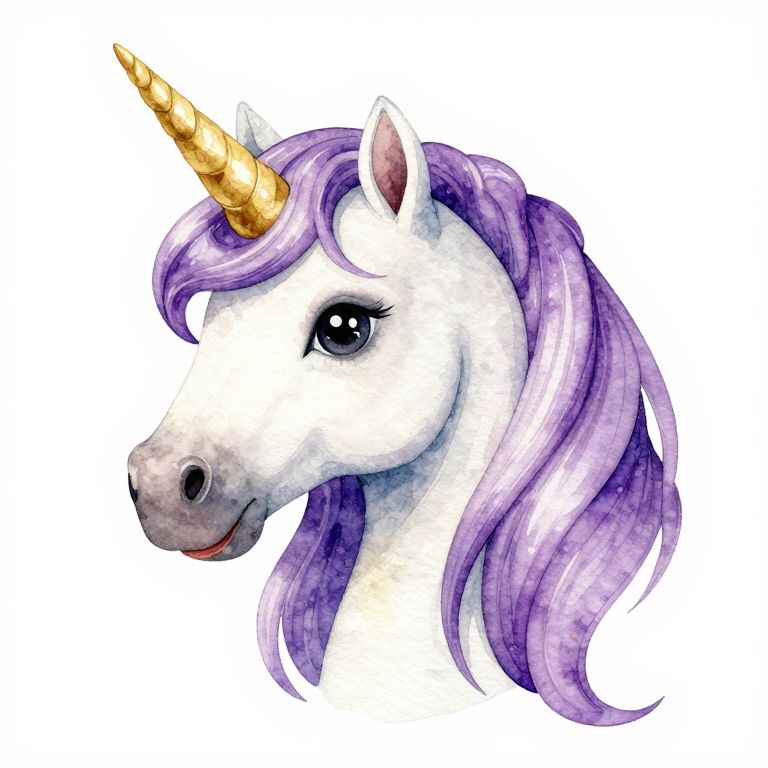 A watercolor illustration of a unicorn with a golden horn and purple mane on a white background.