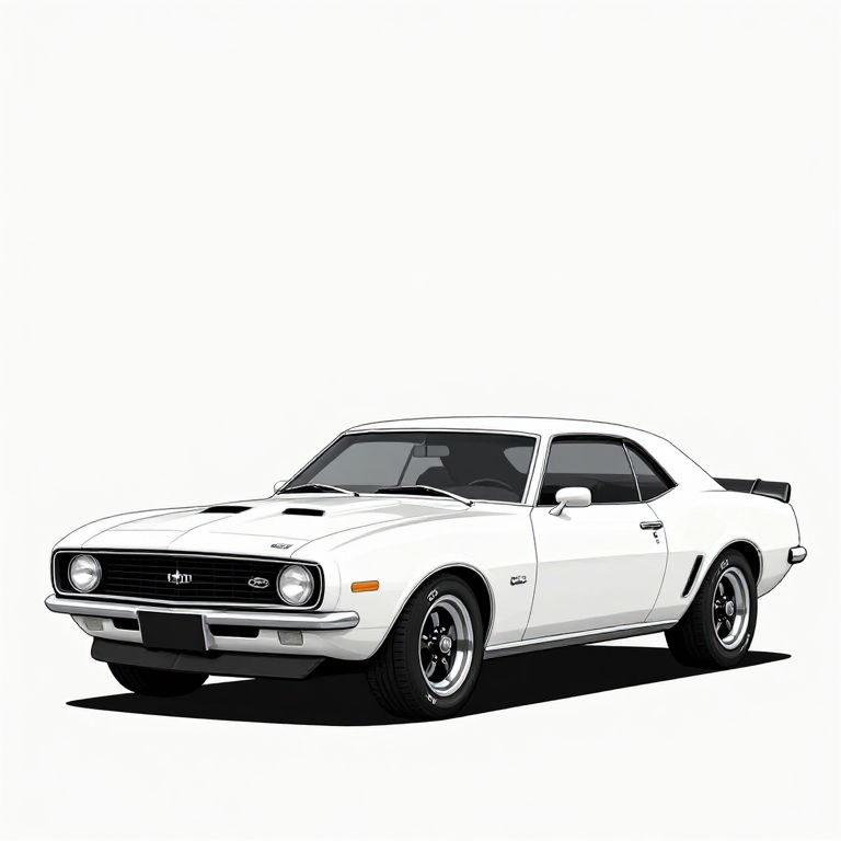 Classic muscle car illustration showcasing a pristine white 1969 Chevrolet Camaro SS with detailed features including a black grille, dual hood scoops, and distinctive \"F70\" tires, rendered in a clean, minimalist style against a plain background.