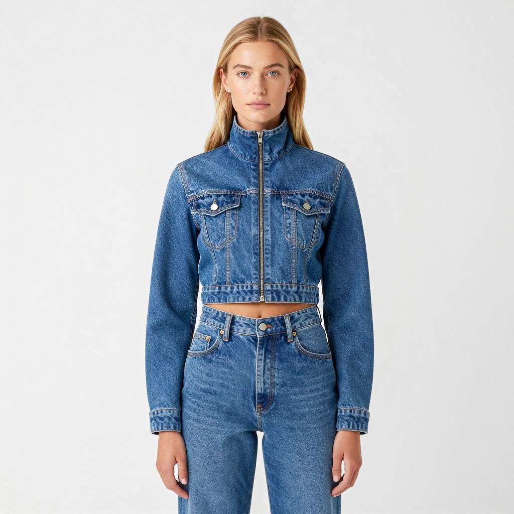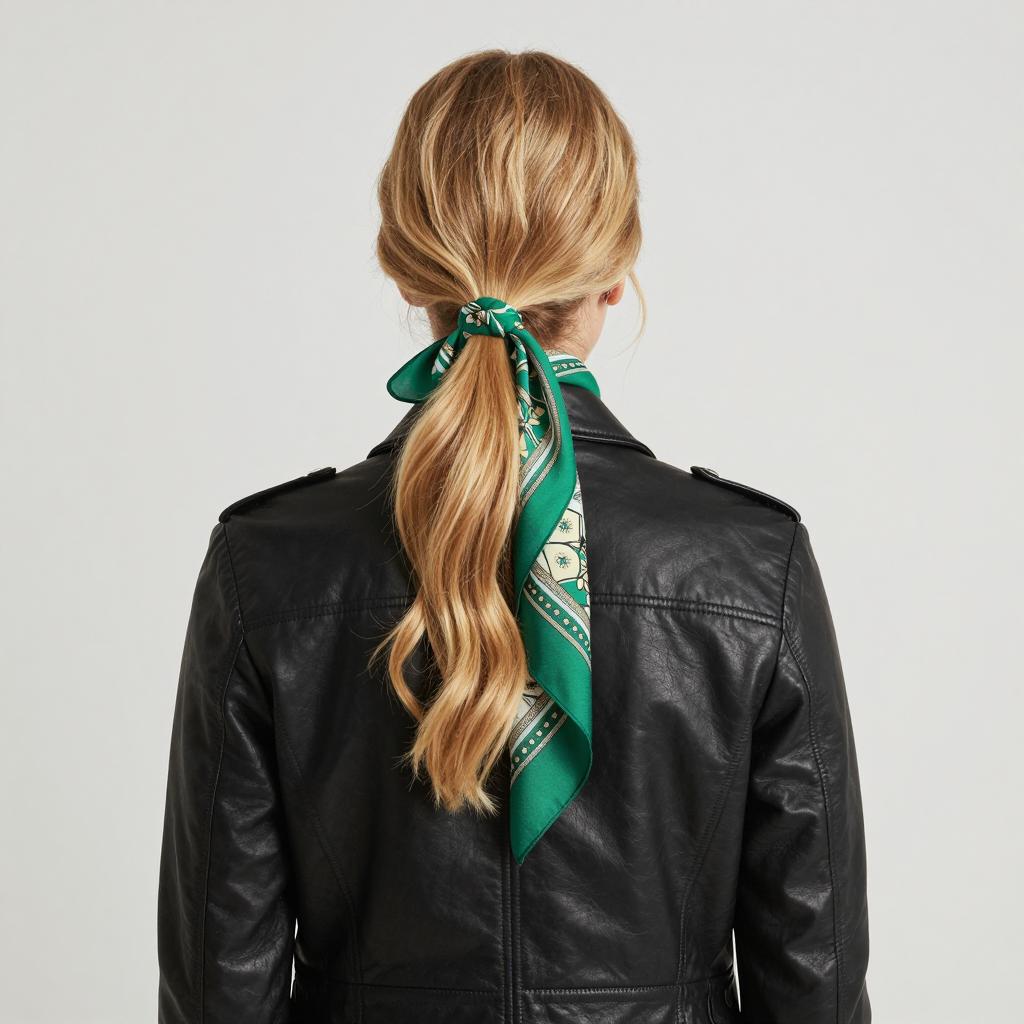 Photograph of a blonde woman from behind, wearing a green patterned scarf tied in a ponytail, black leather jacket, wavy hair, light gray background, upper body centered, no facial expression visible.