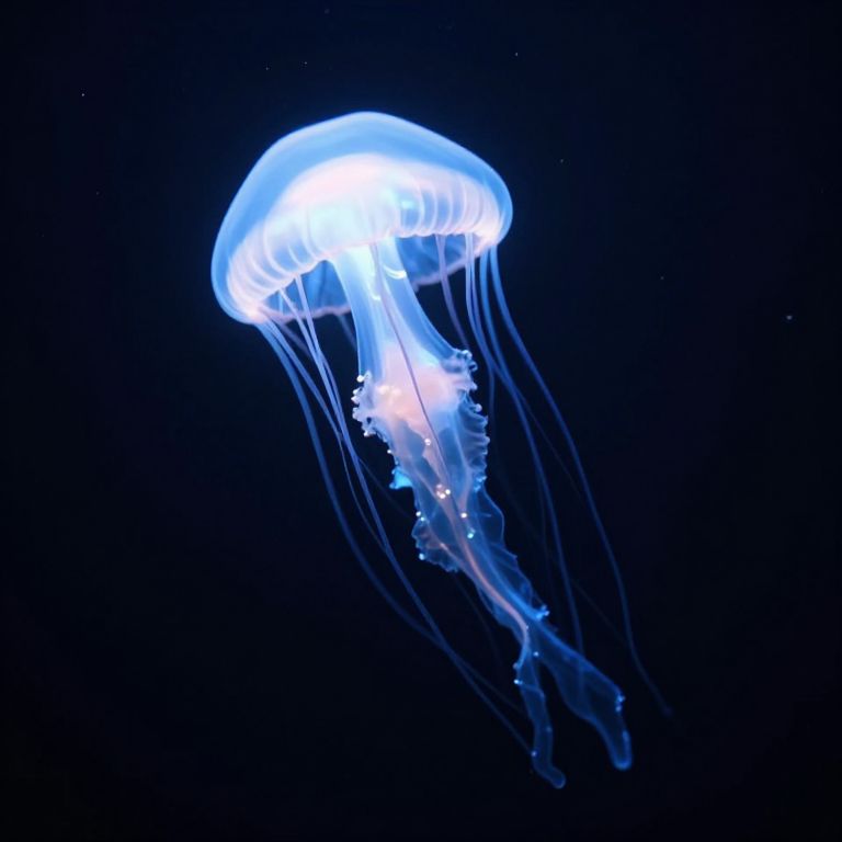 Suspended in the abyssal embrace of a starless void, a luminous jellyfish drifts like a celestial wanderer, its ethereal glow weaving whispers of serenity and mystery, while its bioluminescent tendrils tether the dreams of forgotten realms.