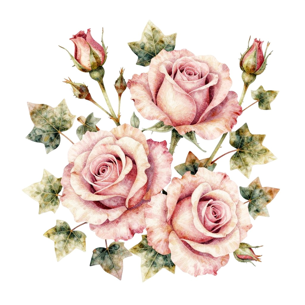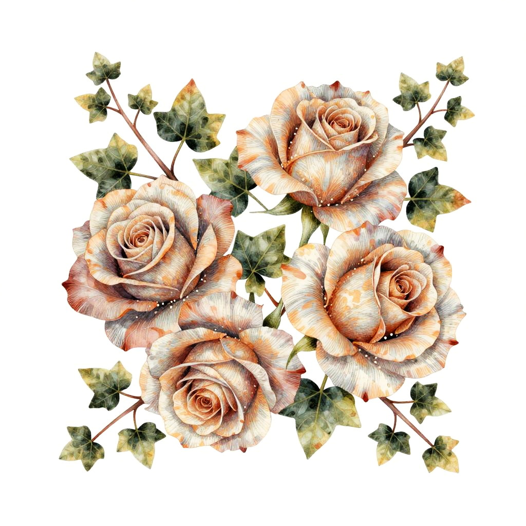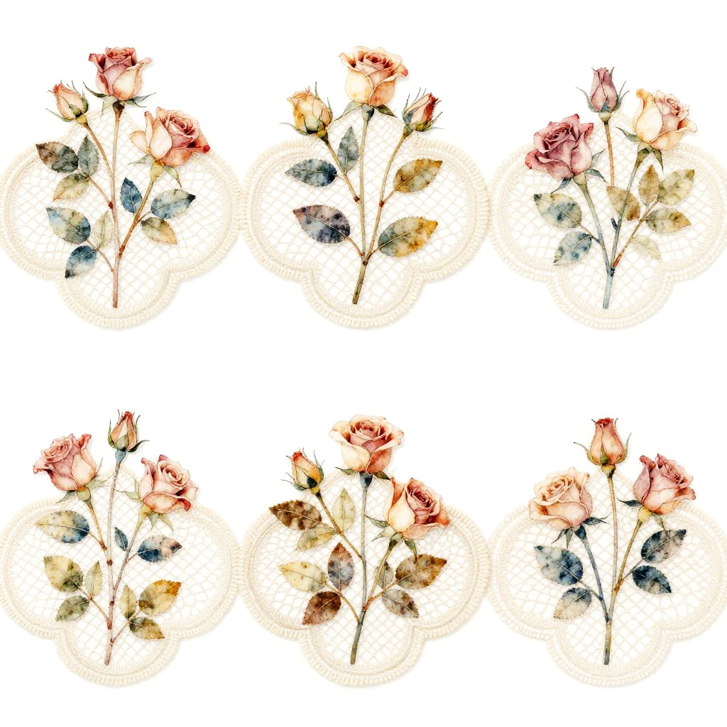 A fabric-effect drawing featuring delicate lace patterns with tiny roses with muted shades and warm natural tones. Designed on a white background, evoking a refreshing and lovely aesthetic with layered elements.