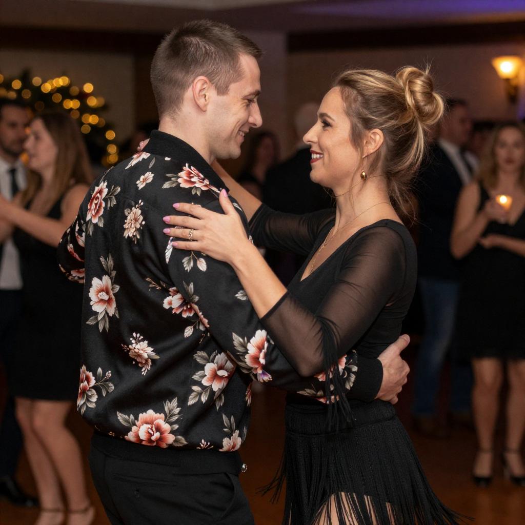 Photograph of a couple dancing. Man with short hair, black floral jacket, smiling. Woman with blonde hair in bun, black sheer dress with fringe, holding a candle, smiling. Background with blurred people, holiday decorations, dim lighting.