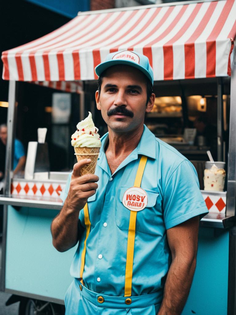 Cinematic realism portrait of a man dressed in a retro ice cream vendor costume, featuring a blue outfit with red and white trim and a matching hat. The man has a mustache and is holding a soft-serve ice cream cone. He stands in front of a vintage style ice cream cart with a striped red and white awning and a display case filled with treats.