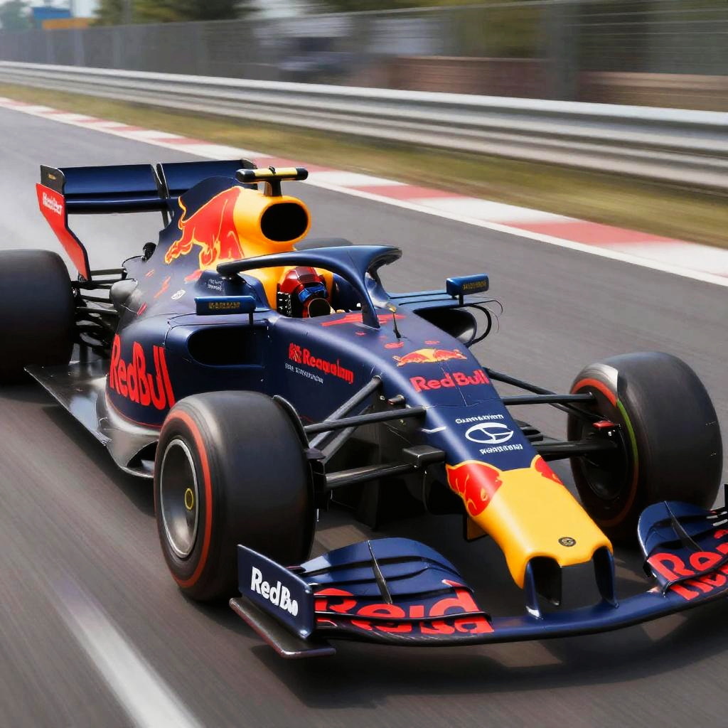 Red Bull F1 car drawing, concept art style with exaggerated features, large rear wing and detailed suspension, bright red and deep blue colors with a metallic finish, energetic background with speed lines and motion blur, emphasizing innovation and racing spirit.