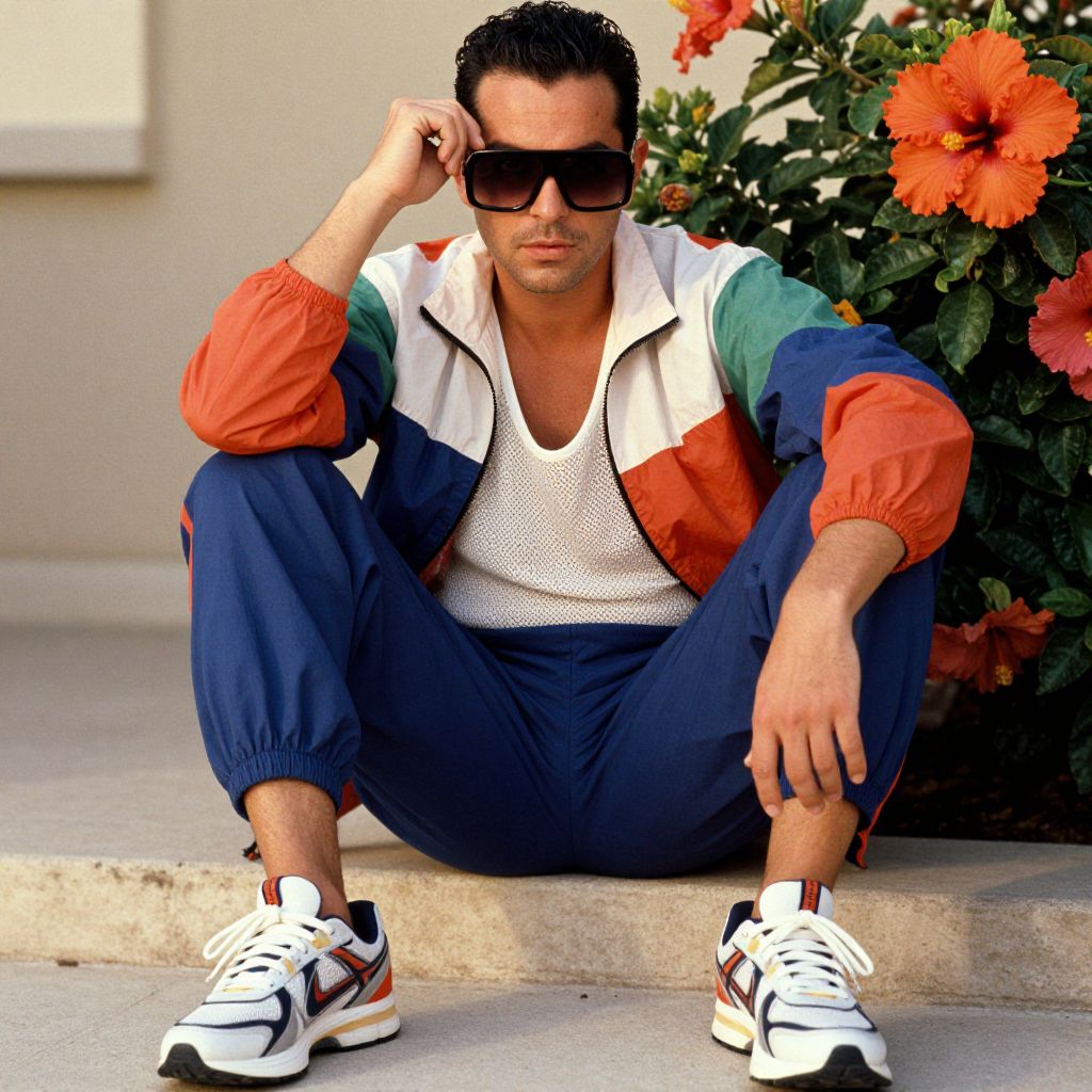 A man, color-blocked windbreaker, tapered joggers, retro running shoes, oversized sunglasses, mesh tank, vibrant hibiscus flowers, Cibachrome style, relaxed expression, warm sunlight.Man has masculine face and piercing eyes