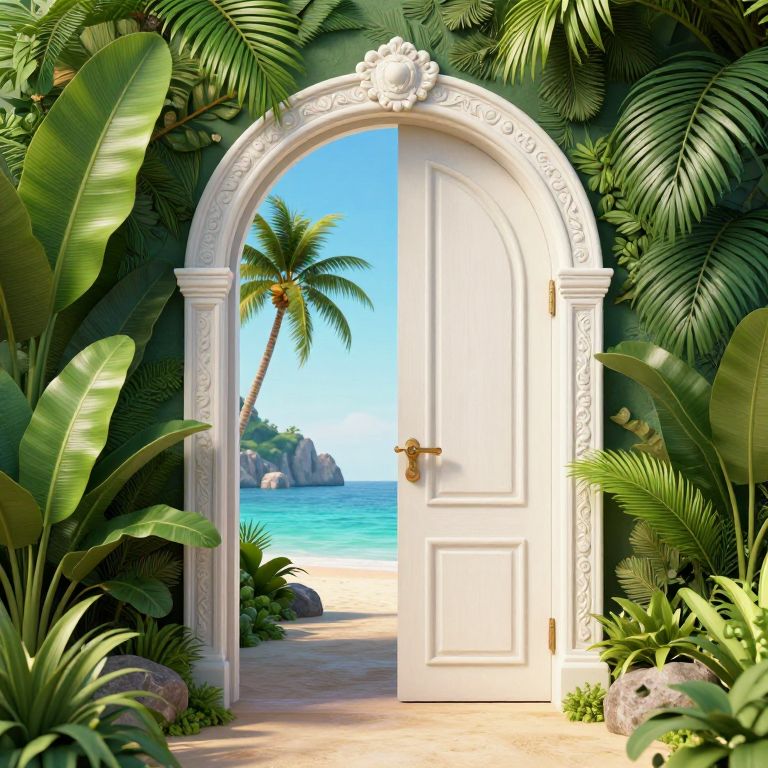 Photorealistic digital artwork of a white, ornately carved arched door set in lush, green tropical foliage. The door is open, revealing a bright, sunny beach with turquoise water, a clear blue sky, and a tall palm tree leaning slightly to the left. Large, vibrant leaves frame the door on both sides, with smaller plants and rocks at the bottom. The door has a gold-colored handle and intricate scrollwork on the top and sides. The background beyond the door shows a distant rocky outcrop in the ocean. The overall scene evokes a sense of hidden paradise and adventure.
