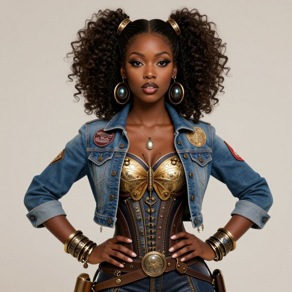 The image depicts a beautifully detailed digital illustration of a steampunk-inspired African American woman. She is adorned in a stylish denim jacket with intricate patches and buttons, complemented by a high-fashion, ornate top featuring a golden butterfly design. Her hair is styled in voluminous, curly pigtails, adding to her striking appearance. She wears large, round earrings and multiple bracelets on her wrists, each with unique designs. The overall composition is symmetrical, with the woman standing confidently with her hands on her hips, exuding a sense of power and elegance. The background is a soft, neutral color, allowing the vibrant details of her attire and accessories to stand out prominently. The image is highly detailed, with a resolution of 8k, showcasing the artist's skill in creating a visually captivating and dynamic scene.