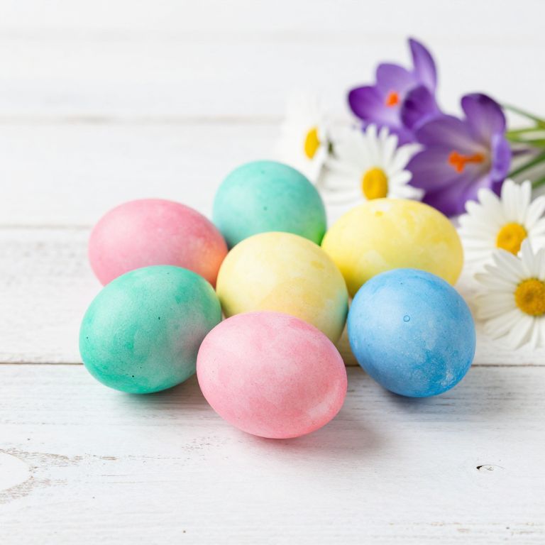 Colorful Easter eggs, naturally dyed in pastel shades of pink, teal, yellow, and blue, rest on a rustic white surface, surrounded by vibrant spring flowers including daisies and crocuses, creating a minimal yet festive composition.