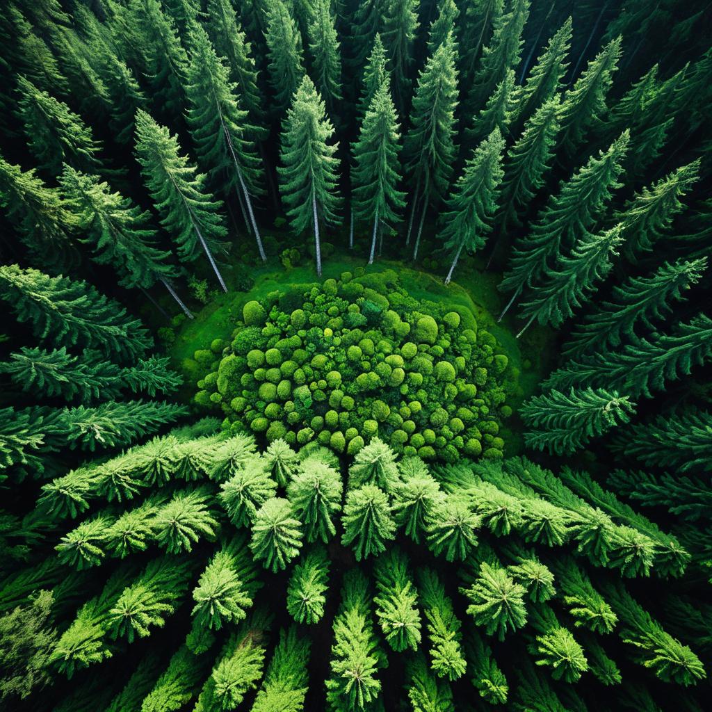 Imagine a lush, verdant forest viewed from above, with a dense canopy of towering pine trees stretching as far as the eye can see. Nestled within this sea of green, there is a striking earth formed from glowing emerald moss. This powerful symbol of sustainability contrasts with the deep greens of the surrounding forest, highlighting harmony between nature and renewal
