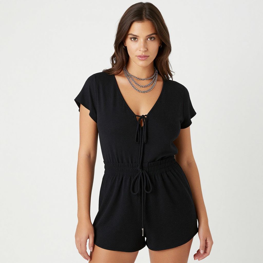 "Woman, contemporary casual, black romper with a V-neckline and lace-up detail, short flutter sleeves, cinched waist with drawstring, short bottom hem, layered silver chain necklace, white studio background.. Sexy. Pretty face and beаutiful eyes. Big breasts."