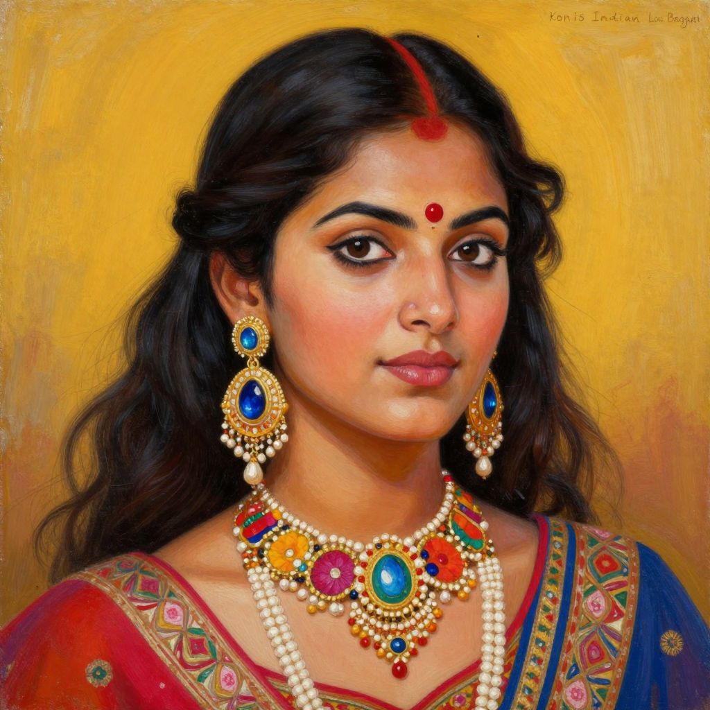 Digital portrait of an Indian woman with dark hair, wearing vibrant gold and gemstone jewelry, red saree, and bindi, against a yellow background
