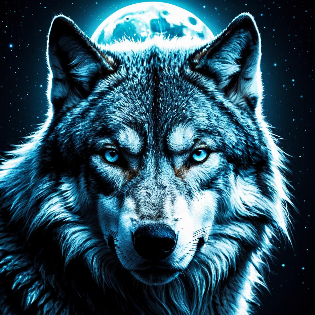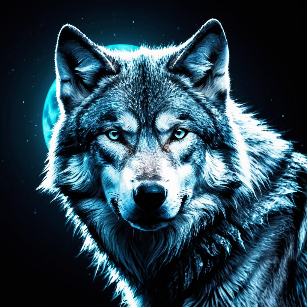 A silver wolf's face lit by moonlight, stylized, representing courage and strength, painted in mystical neon-glow cyber art, impactful composition, with company branding below