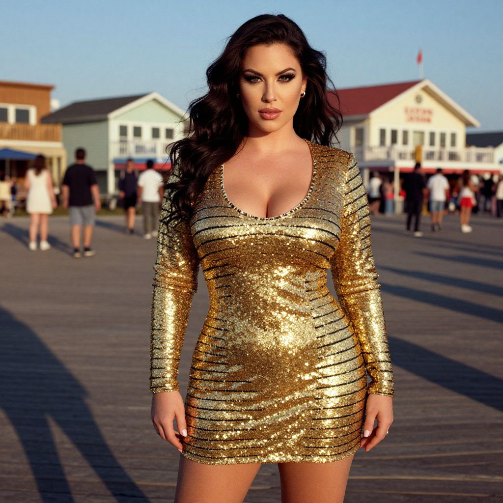 A curvy woman in a gold sequined mini dress with black stripes, long sleeves, and a bodycon fit, stands confidently at a fashionable boardwalk in Seaside Heights, captured in the vibrant style of chromogenic film. Sexy. Pretty face and beаutiful eyes. Big breasts