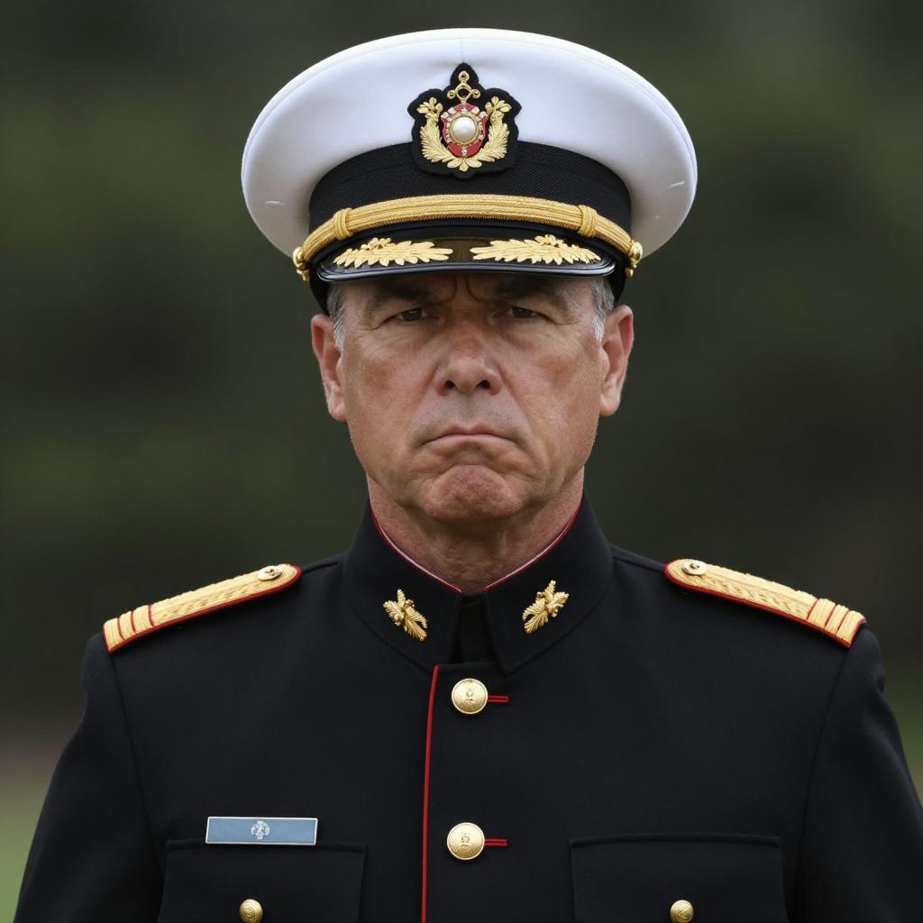 Male officer with light skin, blue eyes, and brown hair wearing a white military hat and black uniform with red trim and multiple medals. He stands at a microphone, looking upward. Large American flag in the background. Close-up, low-angle shot.