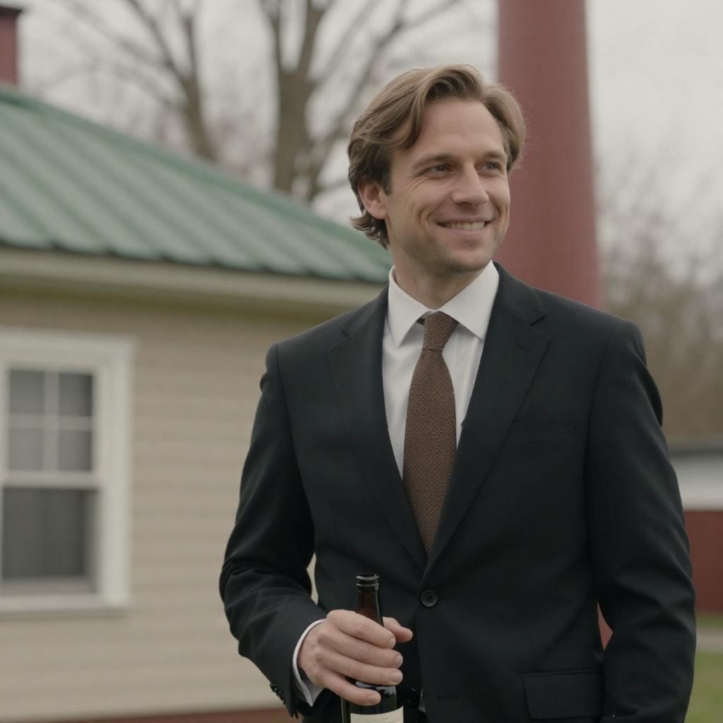 Photograph of a man with light brown hair, wearing a gray denim shirt, standing near a window. He smiles slightly, looking to the left. His right hand touches the window frame. Dimly lit, warm lighting.