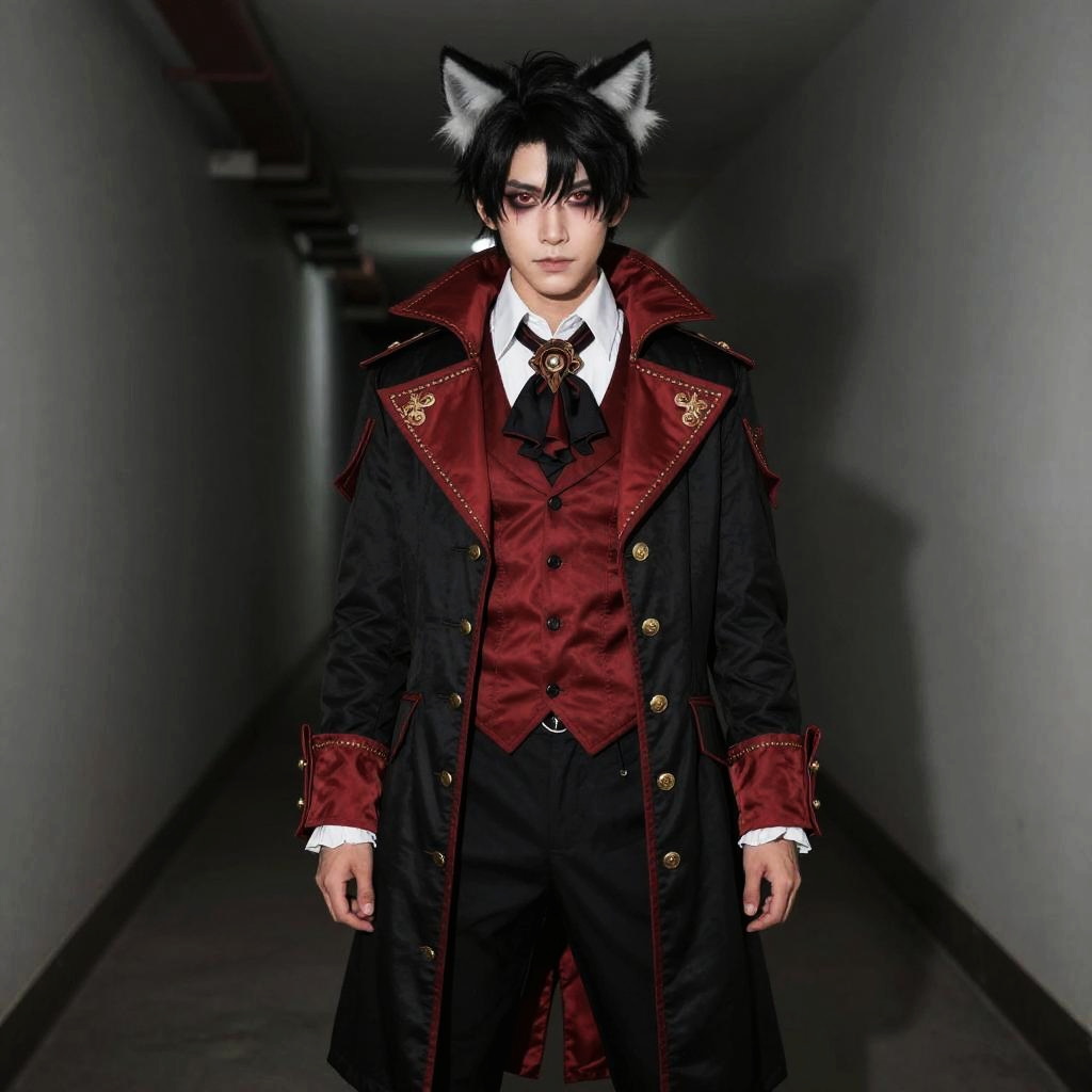 Photograph of an Asian male model with black hair and wolf ears, walking down a dimly lit, narrow hallway. He wears a black, long, Victorian-style coat with red velvet trim and gold buttons, over a red vest and black suit with a white shirt and black tie. The coat has white cuffs peeking out. His expression is serious, and the hallway is shadowy with white walls and a dark floor, creating a dramatic, mysterious atmosphere. The model's outfit and accessories suggest a fantasy or Gothic theme.