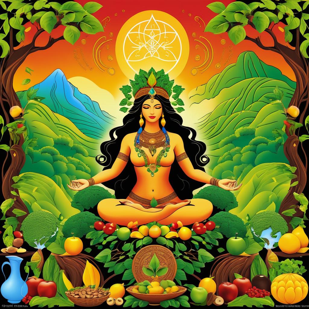 Colorful digital illustration depicting a serene goddess figure meditating in a lush natural environment with vibrant green mountains, trees, and various fruits and nuts surrounding her. The goddess has long black hair, adorned with jewelry and a leafy crown, sitting cross-legged in a yoga pose with a glowing sun and mystical symbols in the background.