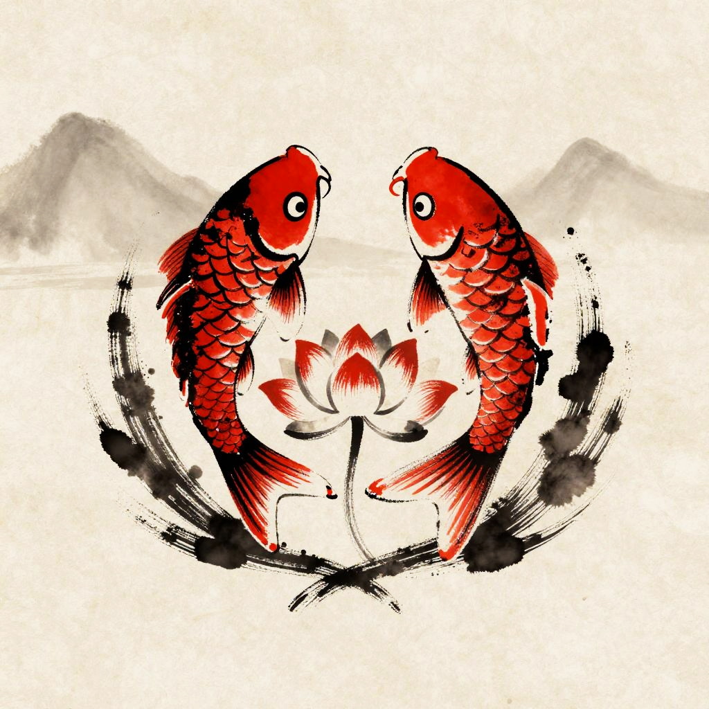 Asian family crest showcasing a stylized koi fish and lotus flower, bold ink brush strokes, vivid reds and blacks, placed on aged rice paper with subtle mountain silhouette behind.
