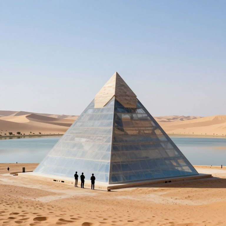 A striking transparent pyramid with a crystal-clear structure stands on the sandy desert shore of a serene lake. The glass-like pyramid mirrors the calm sky above, creating reflective illusions of layered realities in the distance. Three silhouetted figures stand at the pyramid's base, observing the unique architectural landmark amidst vast sand dunes and tranquil water.