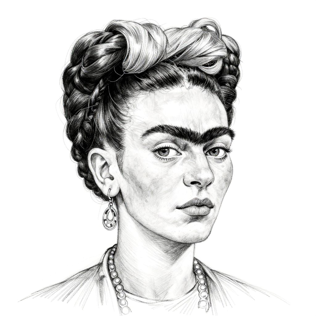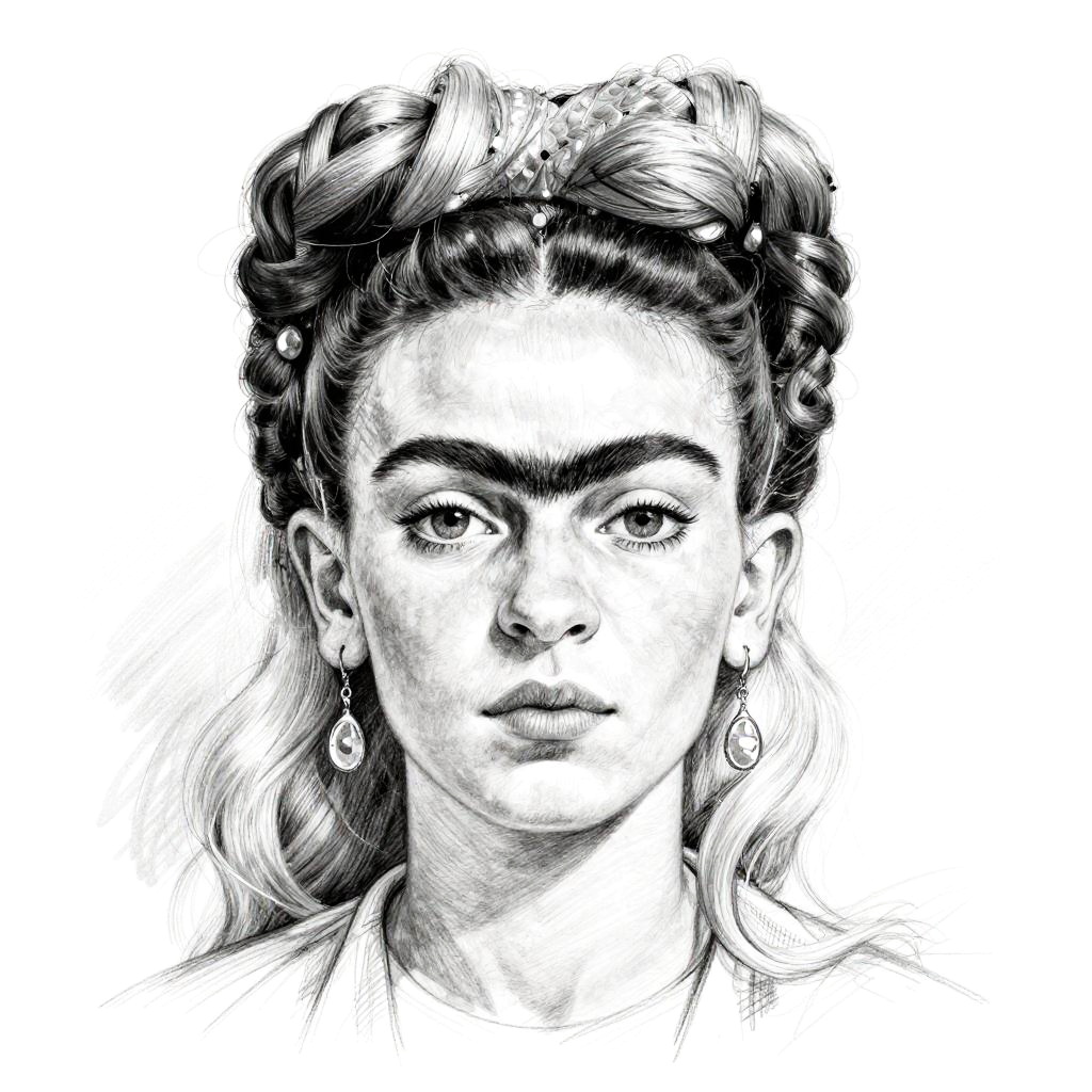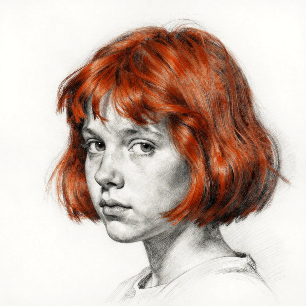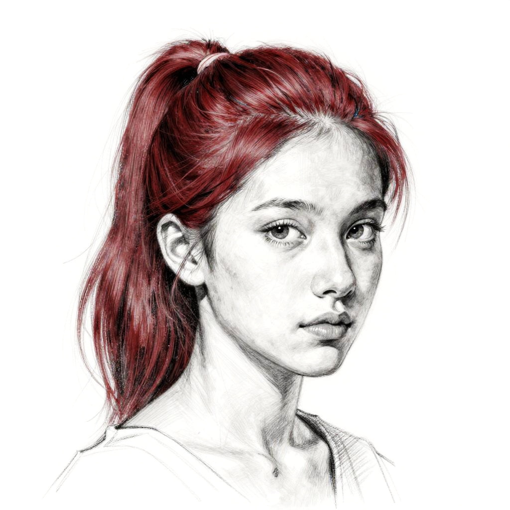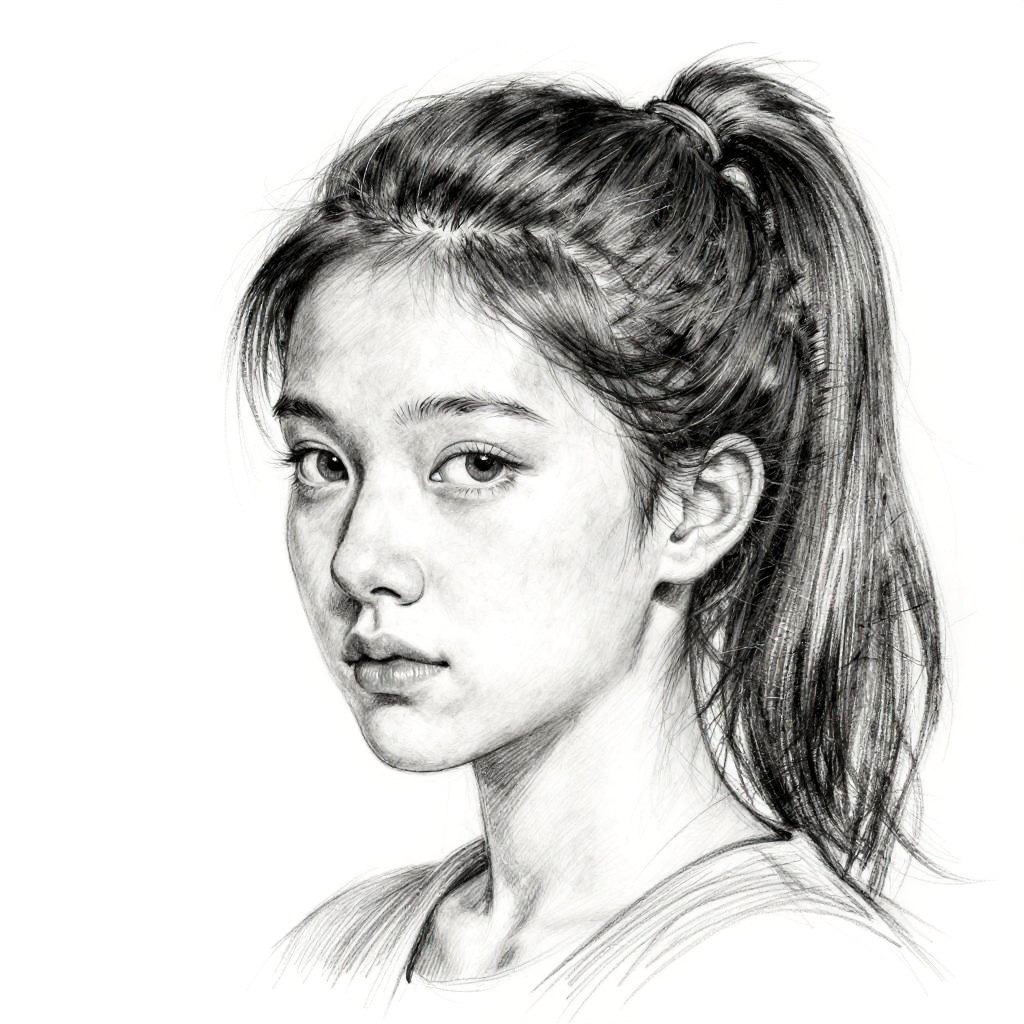 A sketch pencil drawing in black and white of a young woman's face with a high ponytail in her deep auburn hair. Inspired by Henri Matisse, figurative art, three-quarter view. Detailed pencil sketch capturing delicate features and subtle expressions.
