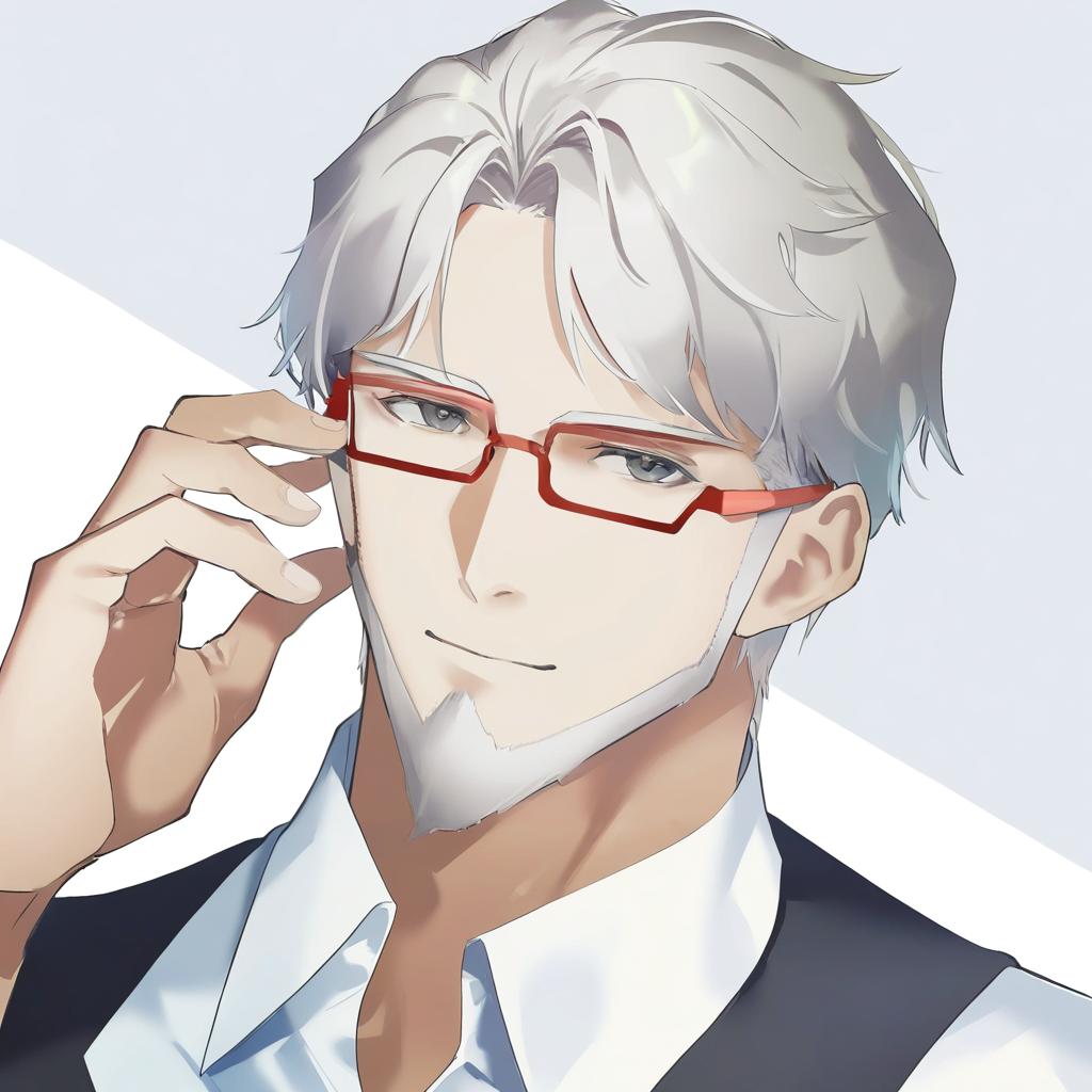 Arurandeisu, holostars, 1boy, mature male, beard, green eyes, grey eyes, glasses, red-framed eyewear, grey hair, short hair, white hair, collared shirt, virtual youtuber, virtual youtuber, goatee, by artist tsurukame, leet
