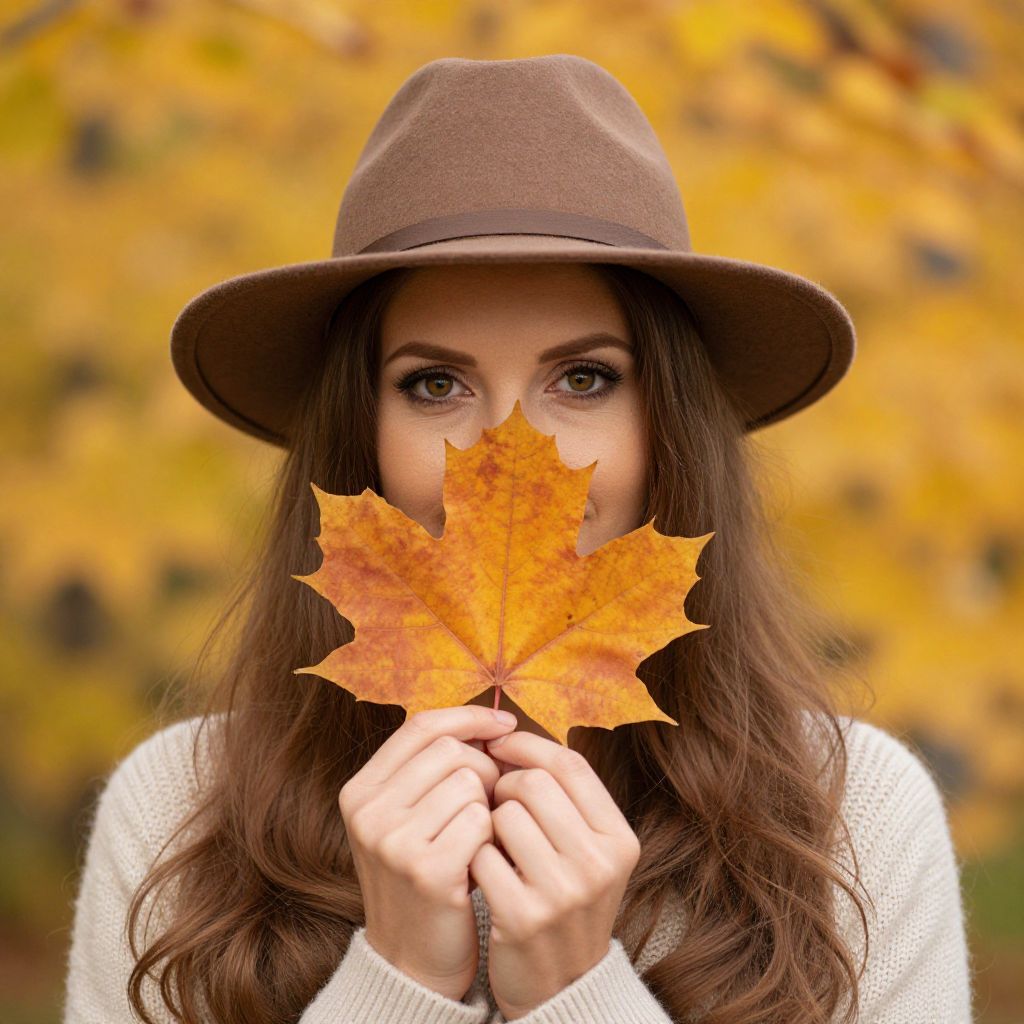 Woman wearing a brown fedora and sweater holds a vibrant orange maple leaf close to her face, set against a blurred backdrop of golden autumn foliage.