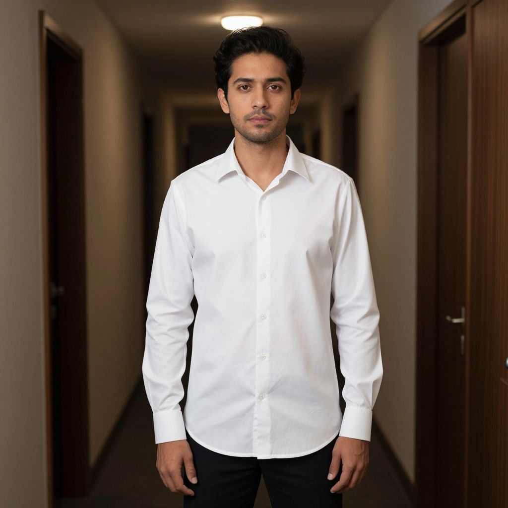 "White Beater Shirt, man in a white shirt standing in a hallway"
