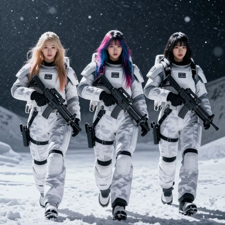 Three Korean female space marines with multicolored hair wearing white winter camouflage body armor are walking in a snowstorm on an icy snowy plain. Each carries an assault rifle and has pistols holstered at their hips. Snowflakes fall thickly, settling on their hair and armor, creating a dramatic high contrast scene.