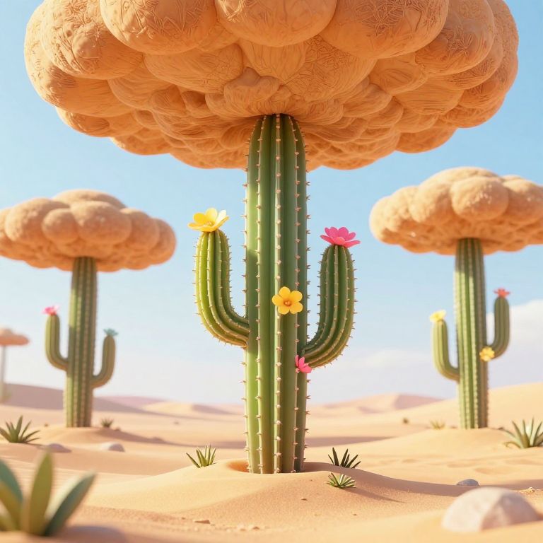 Whimsical CGI desert scene with cactus plants topped with large, orange, cloud-like shapes; colorful flowers bloom on the cacti, set