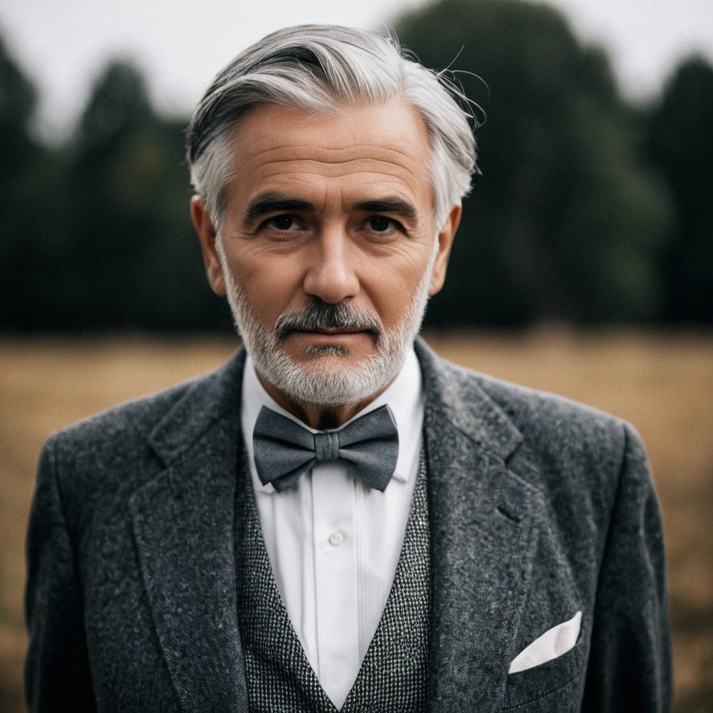 Portrait of an elderly man with white hair and facial hair standing outdoors in a grassy area. He is wearing a white collared shirt, dark trousers with a belt, and suspenders. The background features blurred trees and open green space.